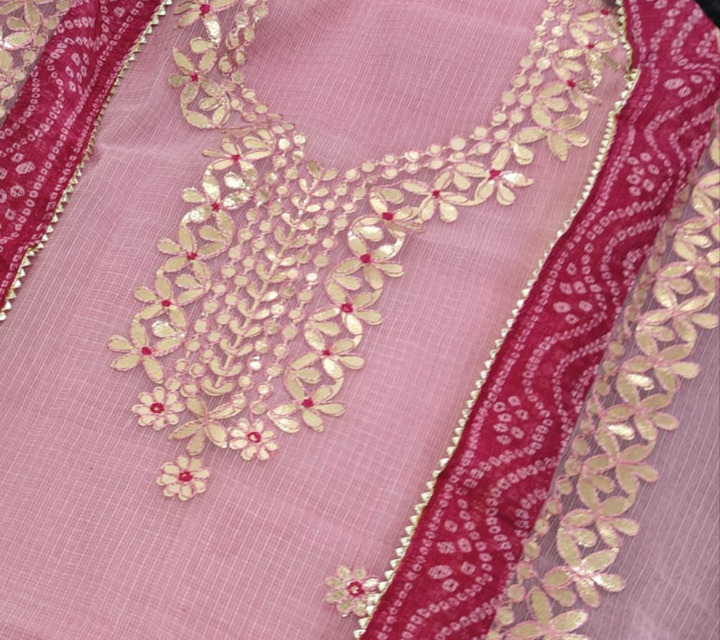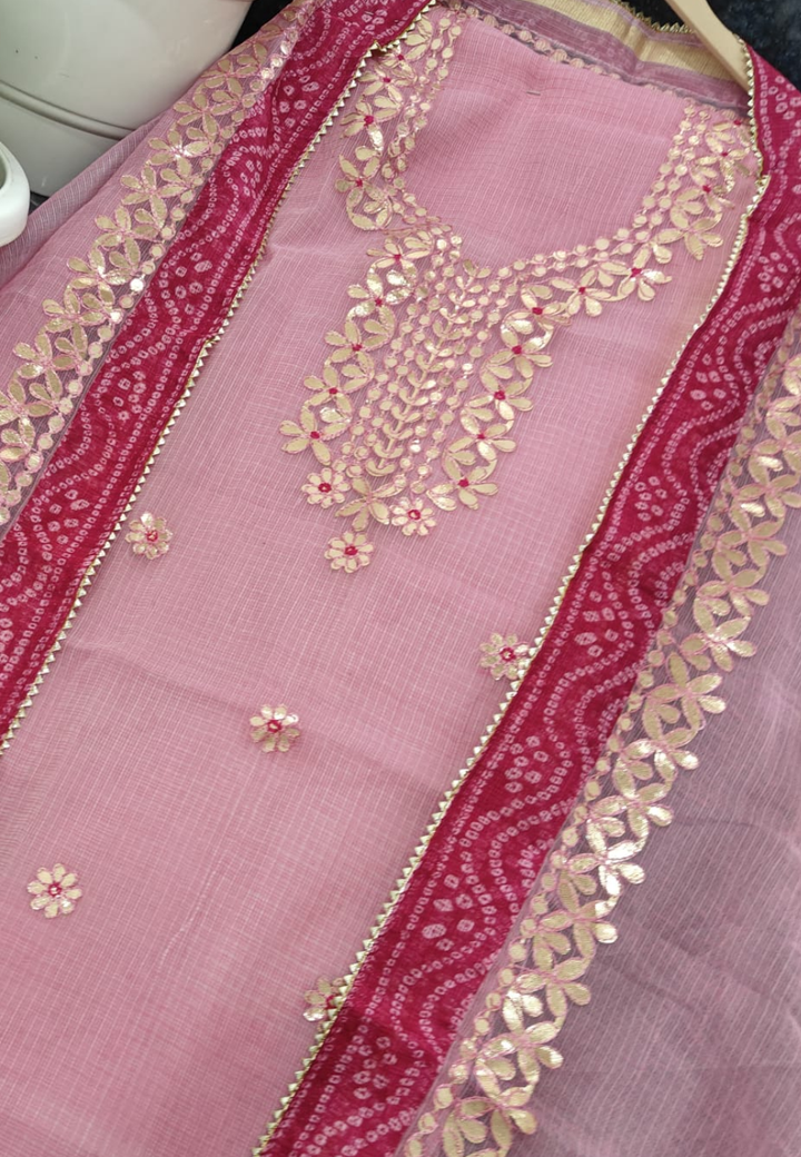 Kota Salwar Suit In Gota Work In pink, This Traditional Suits 2.5 Mtr Top In Kota ,2.5 Mtr Dupatta In Kota,2.5 Mtr Bottom In Cotton, Wear This Kota Doria Suit With Kundan Necklace And Jhumkas On Day Time Function, This Designer Suit Comes With Beautiful Dupatta That Seems Perfect For Any Occasion,Free Shipping And Cod Available, Shipping Worldwide.