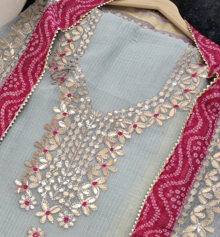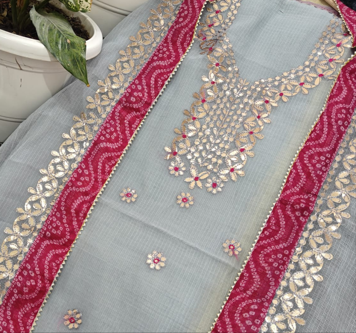 Gopibai- Kota Salwar Suit In Gota Work In grey This Traditional Suits 2.5 Mtr Top In Kota ,2.5 Mtr Dupatta In Kota,2.5 Mtr Bottom In Cotton, Wear This Kota Doria Suit With Kundan Necklace And Jhumkas On Day Time Function, This Designer Suit Comes With Beautiful Dupatta That Seems Perfect For Any Occasion,Free Shipping And Cod Available, Shipping Worldwide.