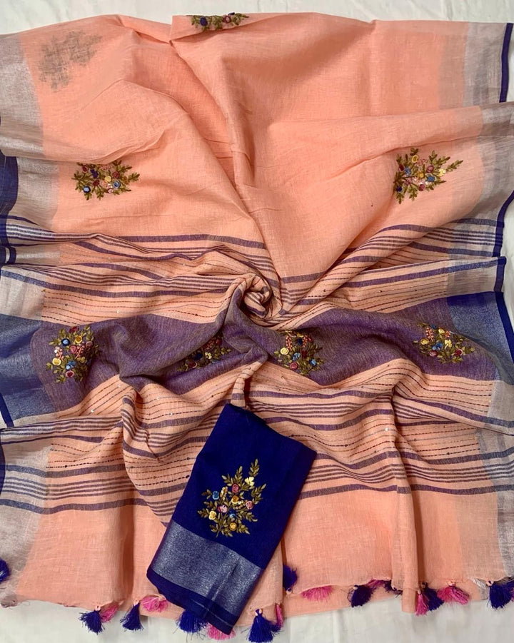 Pure Linen Embroidered Peach Saree Is Crafted In Linen And Features Beautiful Hand Embroidery And Tassel Details .