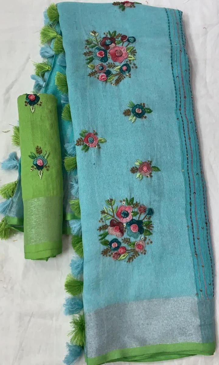 Pure Linen Embroidered Skyblue Saree Is Crafted In Linen And Features Beautiful Embroidery And Tassel Details . Buy This Saree Online from Jhakhas.Com And Style It With A Pair Of Kundan Earrings And Embellished Heels To Make A Statement. This Saree Comes With An Unstitched Blouse Piece.