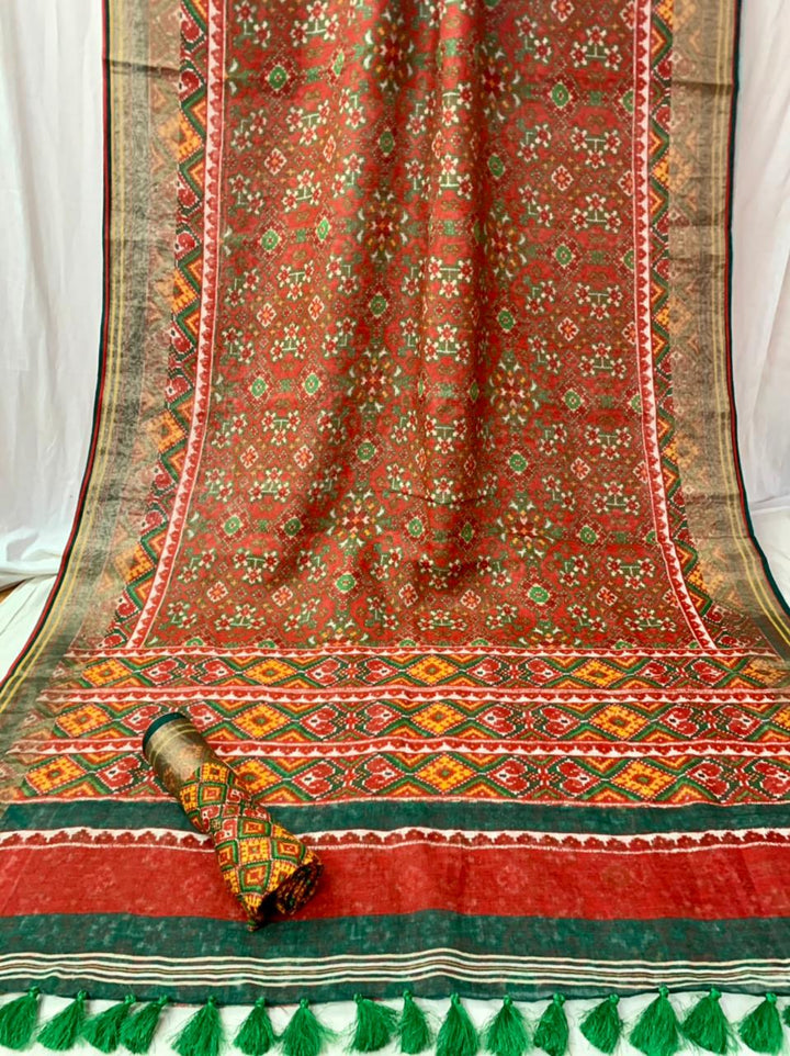 Flaunt Your Style With Our Red Linen Saree With Patola Print Made Out Of Chosen Threads This Saree Is A Must-Have In Your Traditional Wardrobe. Our Linen Sarees Are Always In Fashion And Perfect For Any Of Occasion. This Linen Saree Comes With A Matching Blouse Which Can Be Styled According To Your Design. The Tassels On Pallu Adds Charm To It.