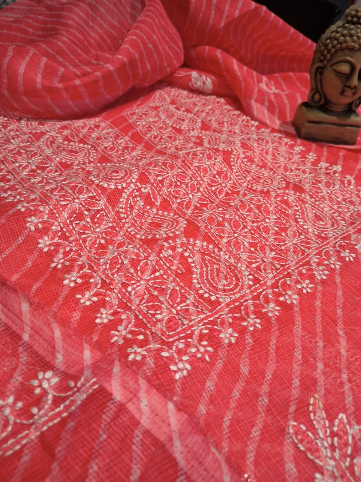 - Trending Carrot Red Kota Silk Leheriya Chikankari Salwar Kameez Set Unstitched Dress Material
