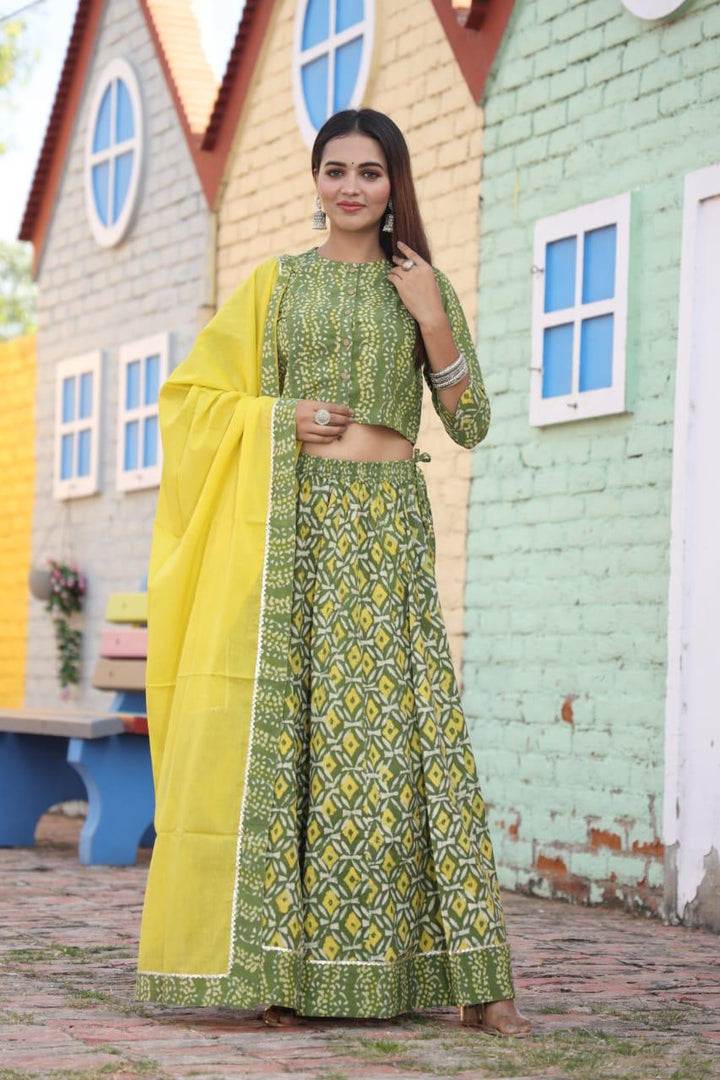 Green Bagru Hand Block Printed Designer Top & Skirt With Mulmul Dupatta.