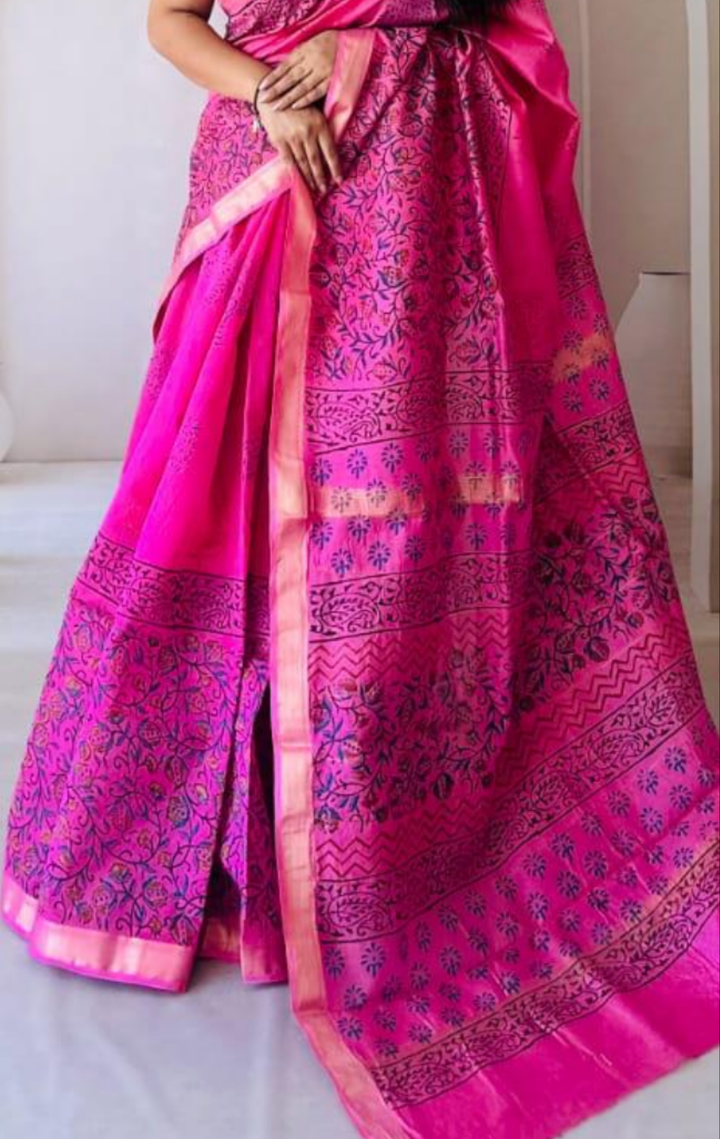 Rani Pink Maheshwari Silk Bagru Hand Block Print Saree