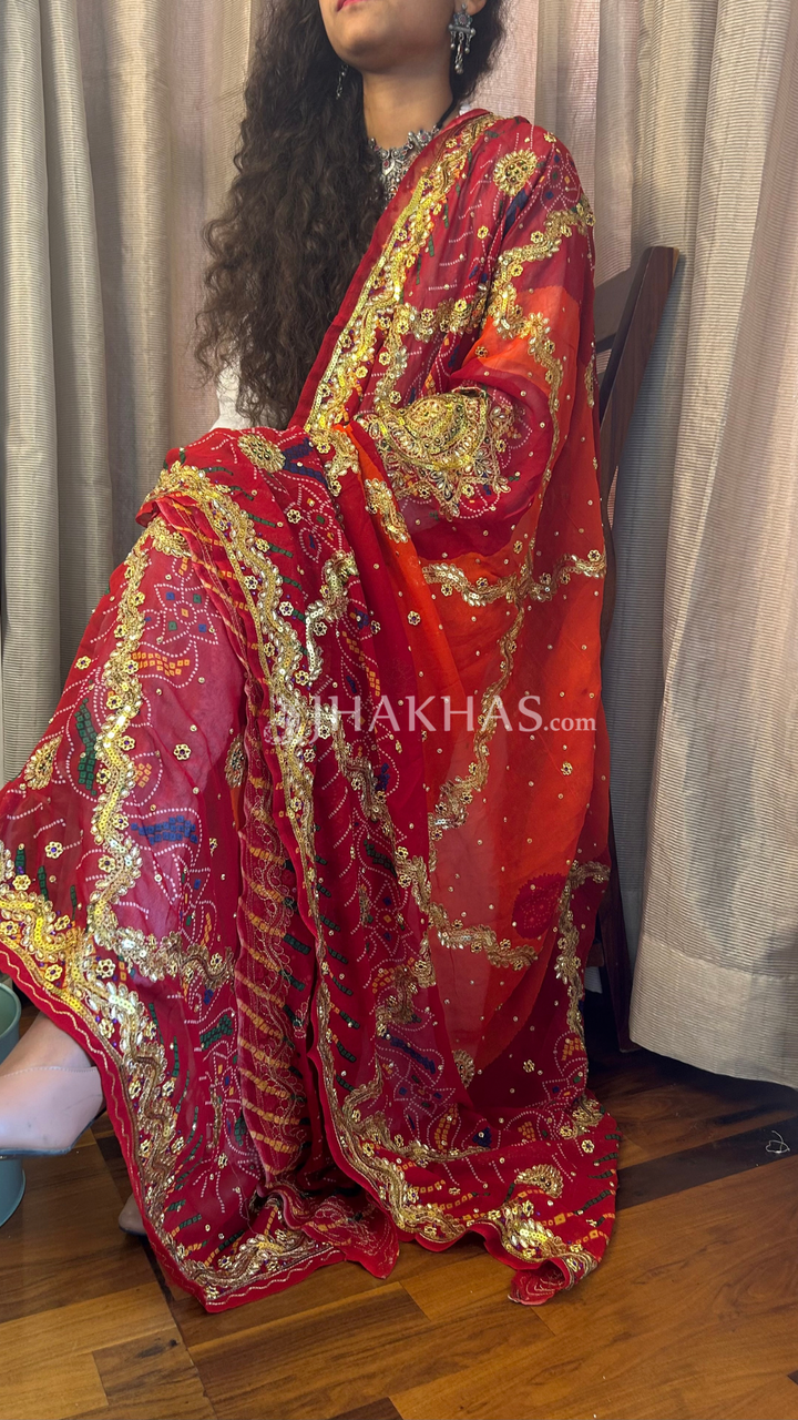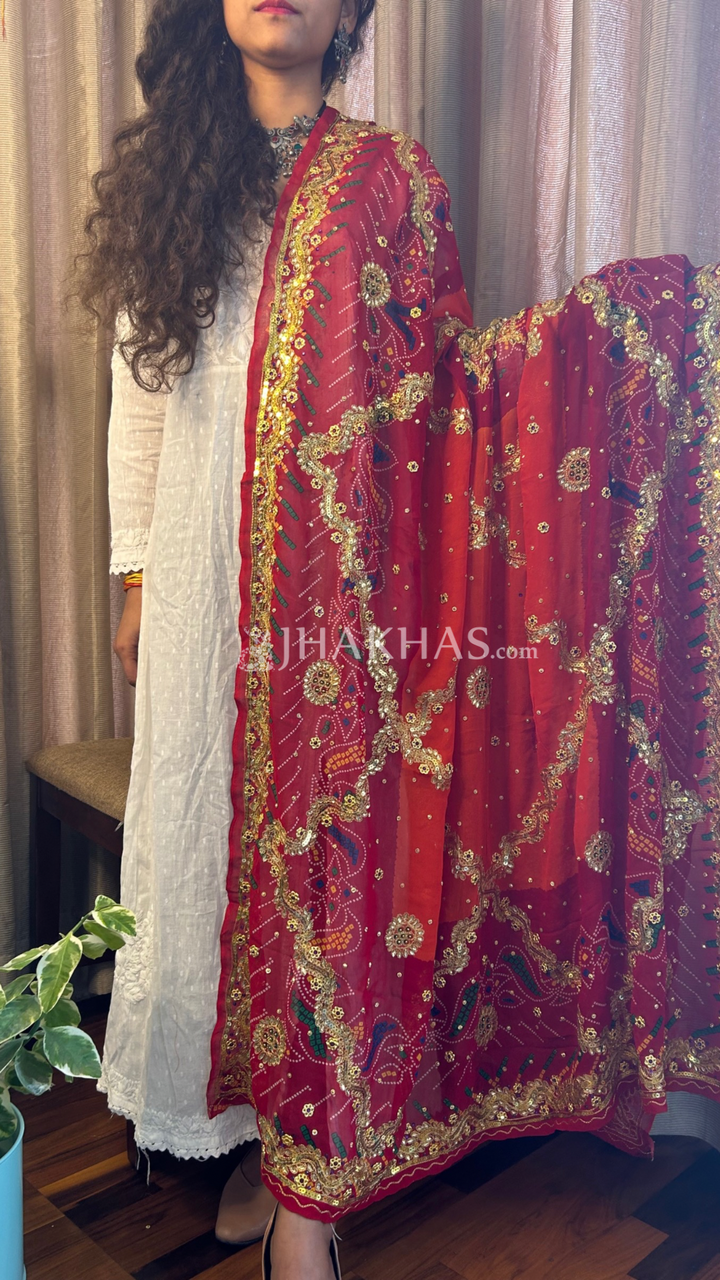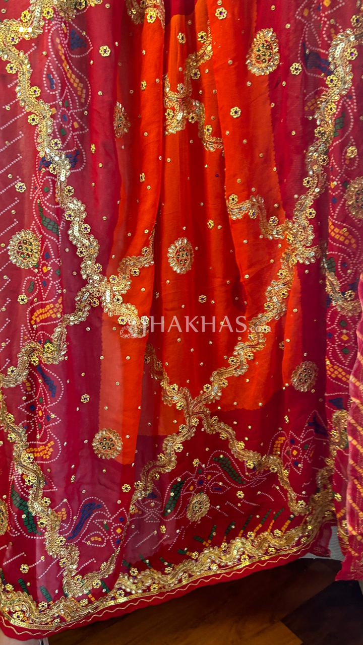 Age Old Tradition, Bandhani Chunari Are Colorful And Vibrant And Portray Age-Old Tradition. Make This Beautiful Bandhani Georgette Dupatta A Part Of Your Traditional Wardrobe And Make Your festivities And Wedding Celebrations Special. This Bandhej Georgette Chunari Is Embellished With Beautiful Gota Patti Work.