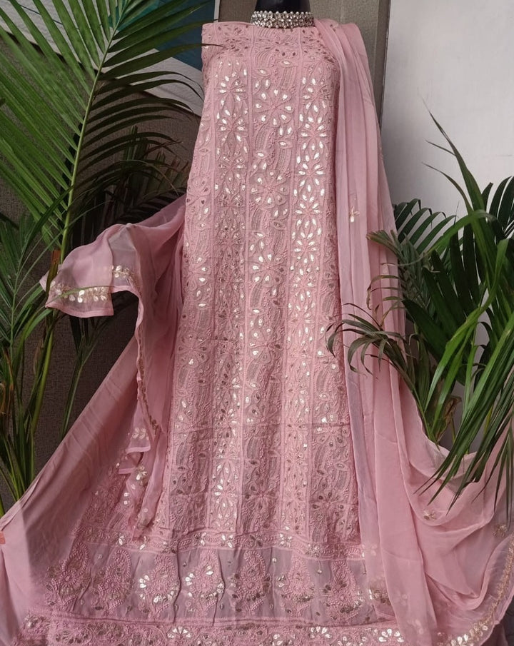 "Rani" Blush Pink Panel Lucknowi Chinkari Georgett Gota Patti Salwar Suit Fabric Material(Unstitched)