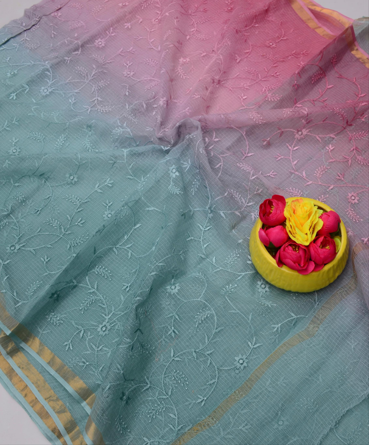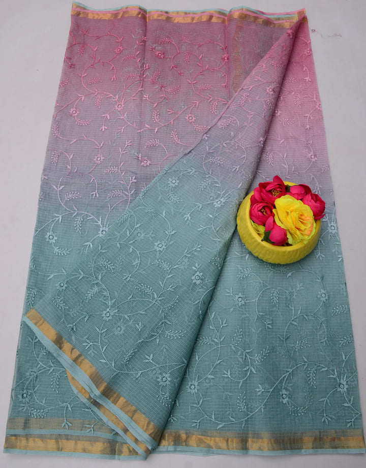 Lali- Dusty pink & Green Kota Doria All Over Embroidery Work Saree, This Kota Doria Saree In Cotton Comes With Blouse.Wear This Kota Doria Saree as Office Wear Saree, Daily Wear Saree Or Kitty Party Saree. Saree Length - 6.5 Mtr With Blouse.