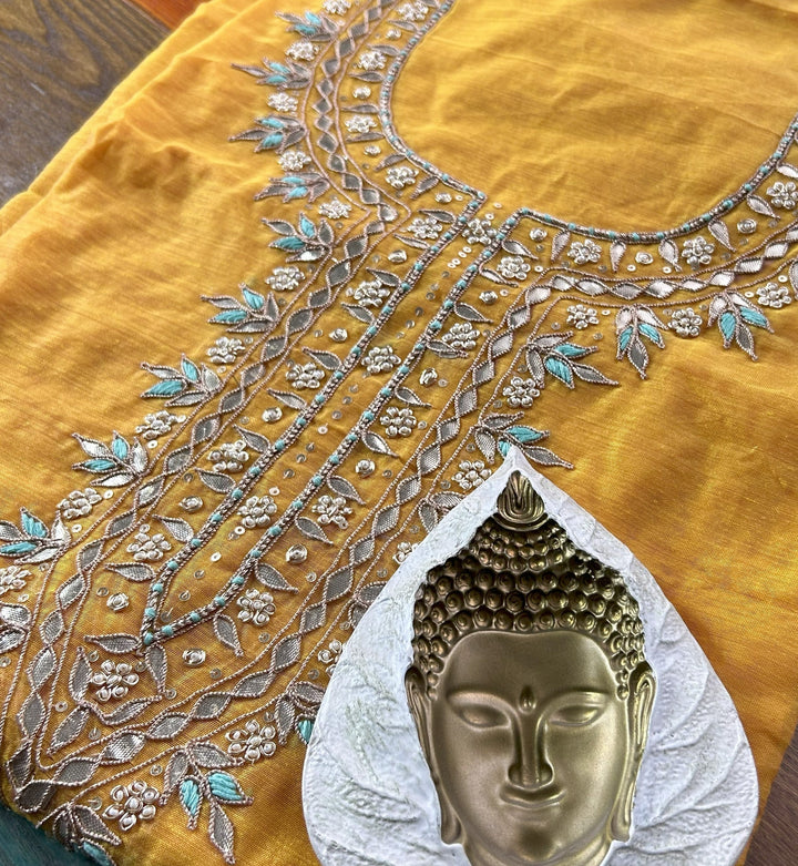 Create a impact by this sophisticated chanderi kurti. This Golden Unstitched Gota Patti kurti is beautified with gota patti work as shown. Ideal for parties, event, outing & weekend get together. Team it with high heels and fashionable accessories to look more attractive. This attractive kurti set will surely fetch you compliments for your rich sense of style.Fabric Length - 2.5 Mtr full length kurti unstitched material