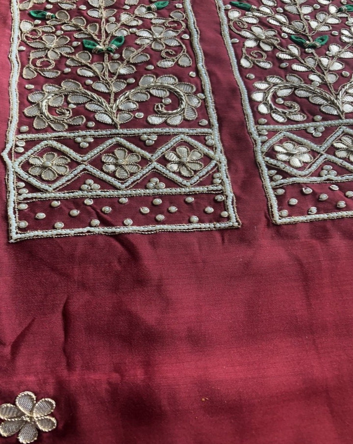 This Unstiched Gotapatti Kurti by Jhakhas is crafted in Chanderi Cotton and Can Be Stiched As Per Your Fit And Choice. Featuring a handwork on set, round neckline, 3/4th sleeves, this Kurti offers a comfortable fit, Can Be Paired With Straight Pants or Plazzos. Style this dress with a pair of stud earrings and a pair your heels to attain a casual look. Due to the handmade nature of our products there can be variations in colours.Fabric Length - 2.5 Mtr full length kurti unstitched material