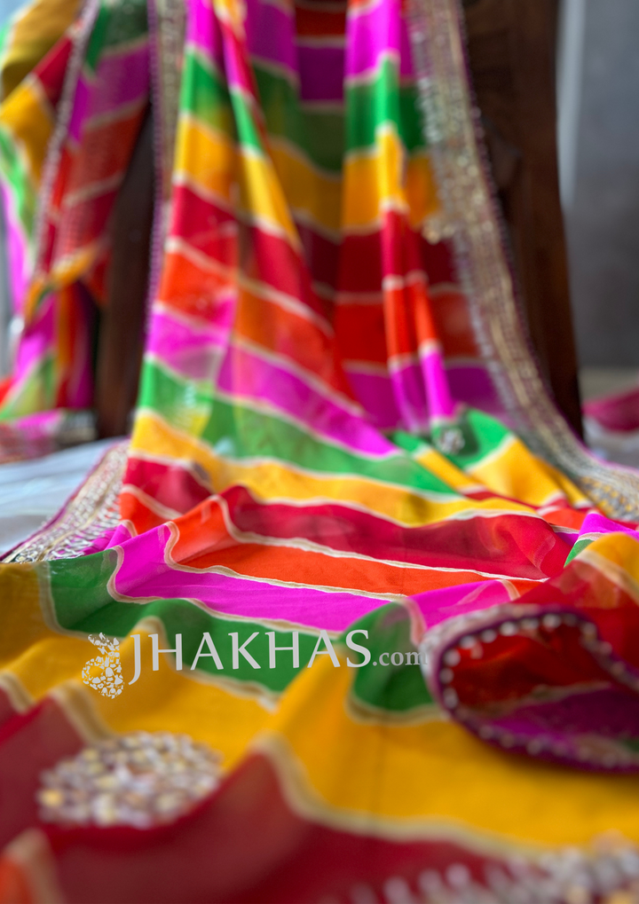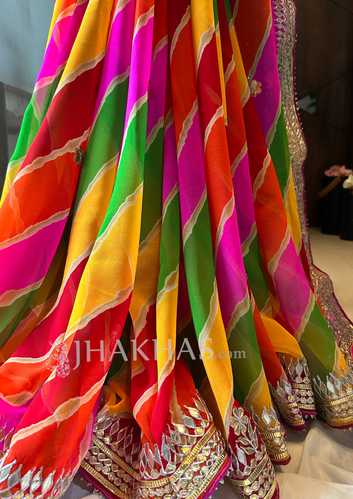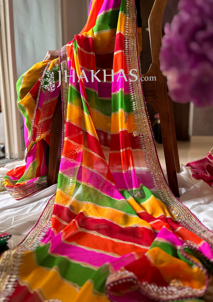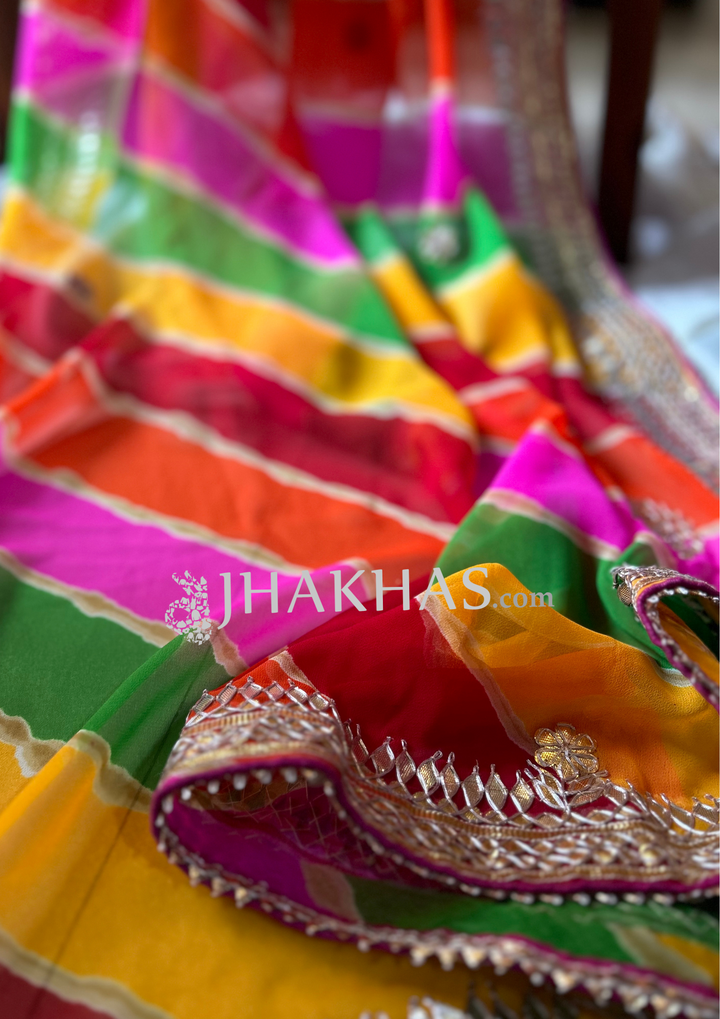 From The Land Of Rajasthan We Bring To You This Exquisite Hand Crafted Multi Color Georgette Mothra/Leheriya Gota Patti Work Saree. This Multi Color Gota Patti Saree With A Unique Gota Patti Work Make It A Must Have For Your Closet. Shop More Leheriya , Mothra And Bandhej Gota Patti Sarees At Jhakhas.Com.
