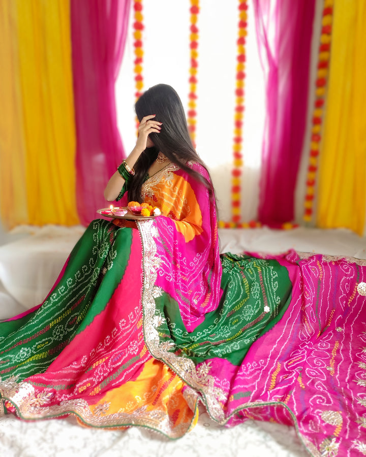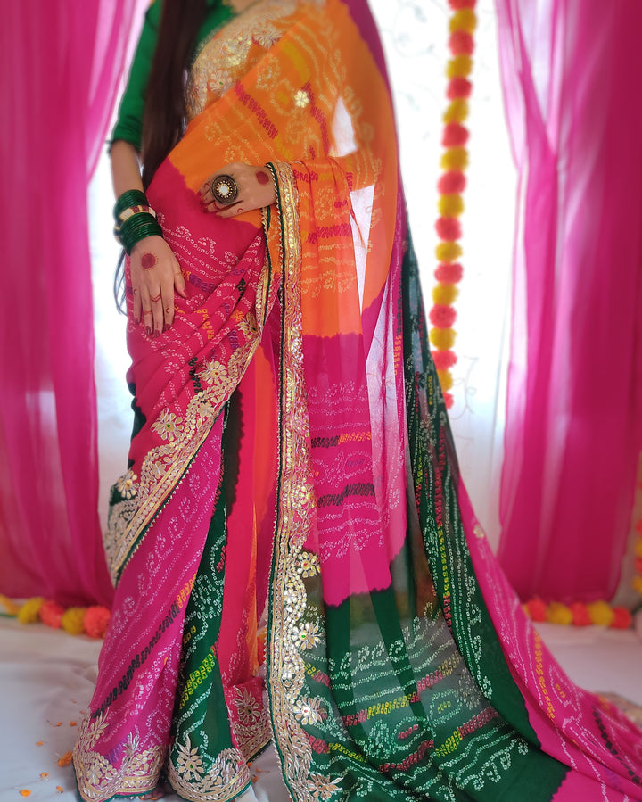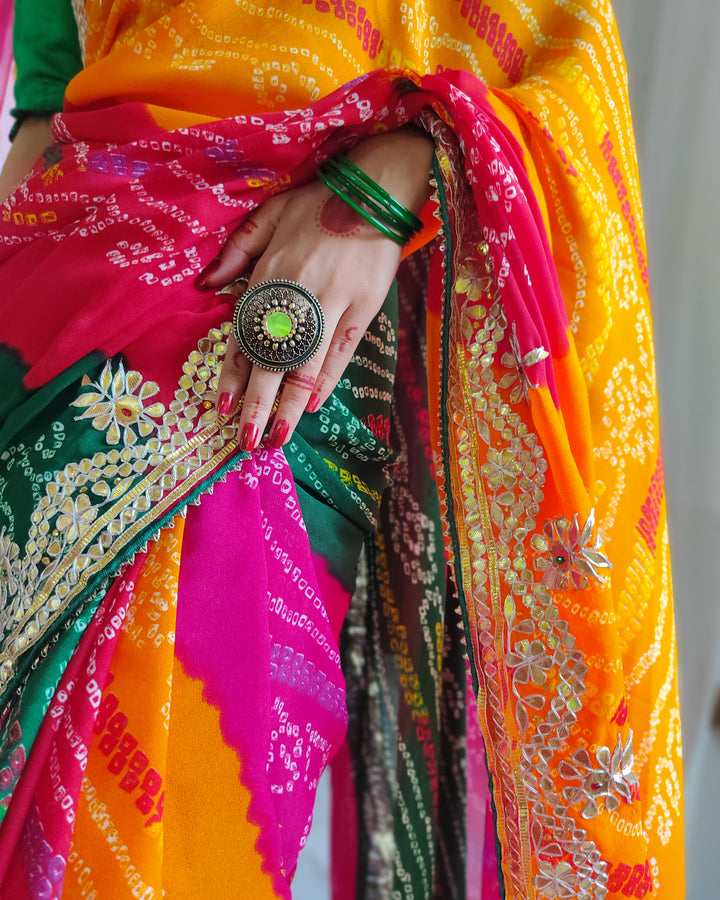 From The Land Of Rajasthan We Bring To You This Exquisite Hand Crafted Multi Color Georgette Bandhej Gota Patti Work Saree. This Multi Color Gota Patti Saree With A Unique Gota Patti Work Make It A Must Have For Your Closet. Shop More Leheriya , Mothra And Bandhej Gota Patti Sarees At Jhakhas.Com.