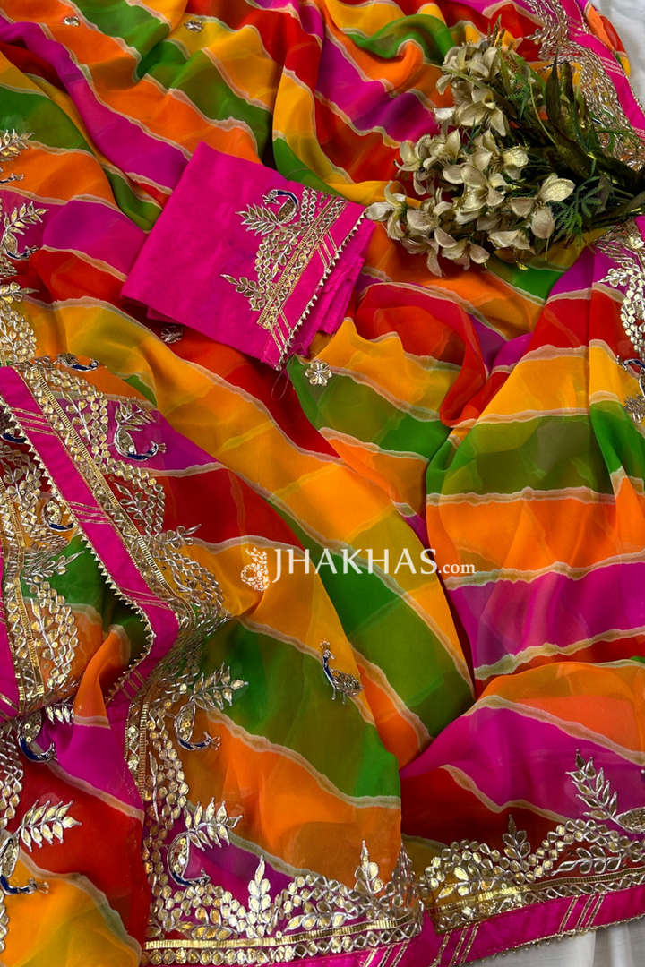 From The Land Of Rajasthan We Bring To You This Exquisite Hand Crafted Multi Color Georgette Mothra Gota Patti Work Saree. This Multi Color Gota Patti Saree With A Unique Gota Patti Work Make It A Must Have For Your Closet. Shop More Leheriya , Mothra And Bandhej Gota Patti Sarees At Jhakhas.Com.