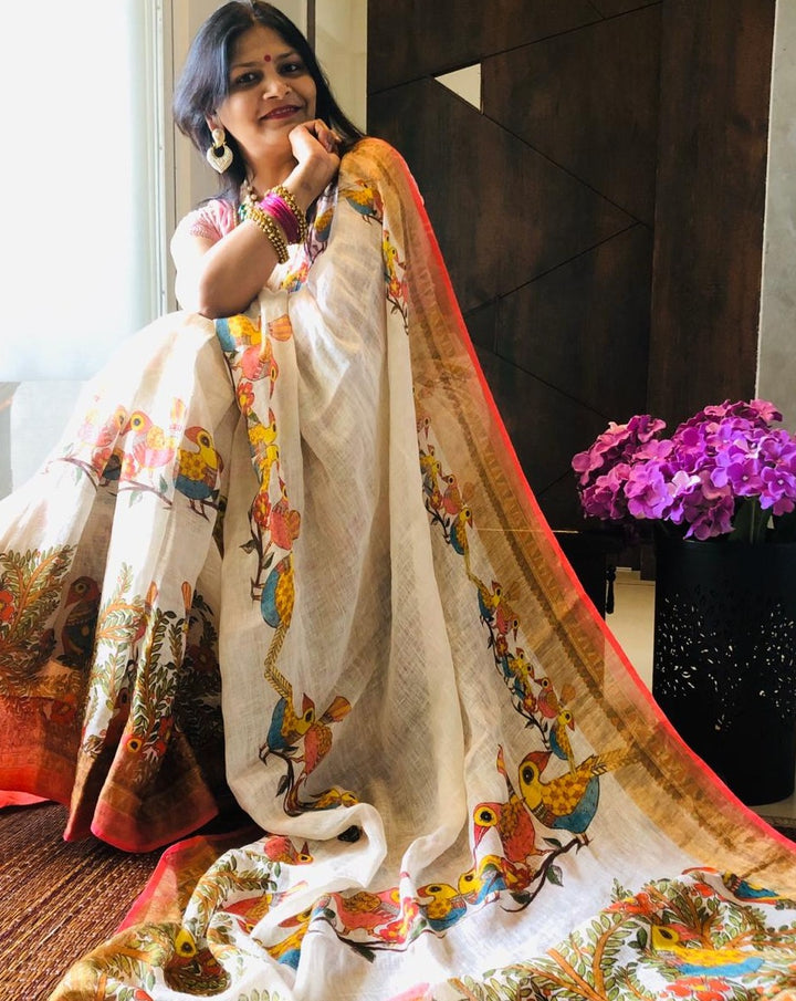 Look Phenomenal In Off White Linen Saree With Beautiful Birds Print. Made Out Of Chosen Threads, This Linen Sarees Are Wardrobe Essential And All Season Wear. Our Linen Saree Comes With A Matching Blouse Which Can Be Customized According To Your Style. Bag It Now!