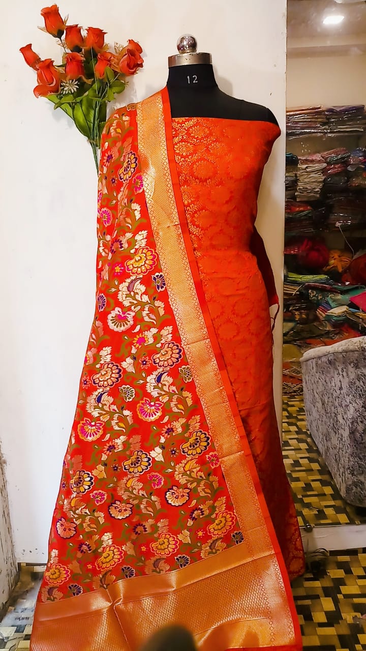 The entrancing weave of a banarasi suit is one that has continued to hold women fascinated by its elegance from time immemorial. Buy Now, This Orange Banarasi Silk Katan Dyeable Suit all over jacquard weaving with zari each approx 2.5 mtrs silk weaving available only Jhakhas to add plenty of charm your look. The beautiful dupatta with floral hand work all over it just looks so gorgeous. Team it with an bindi or Heels For A Charming Appeal. Free Shipping And Cod Available, Shipping Worldwide. You can browse over options for banarasi silk suits online on Jhakhas.com. We offer attractive discounts, cash on delivery and hassle free returns on all of our orders.