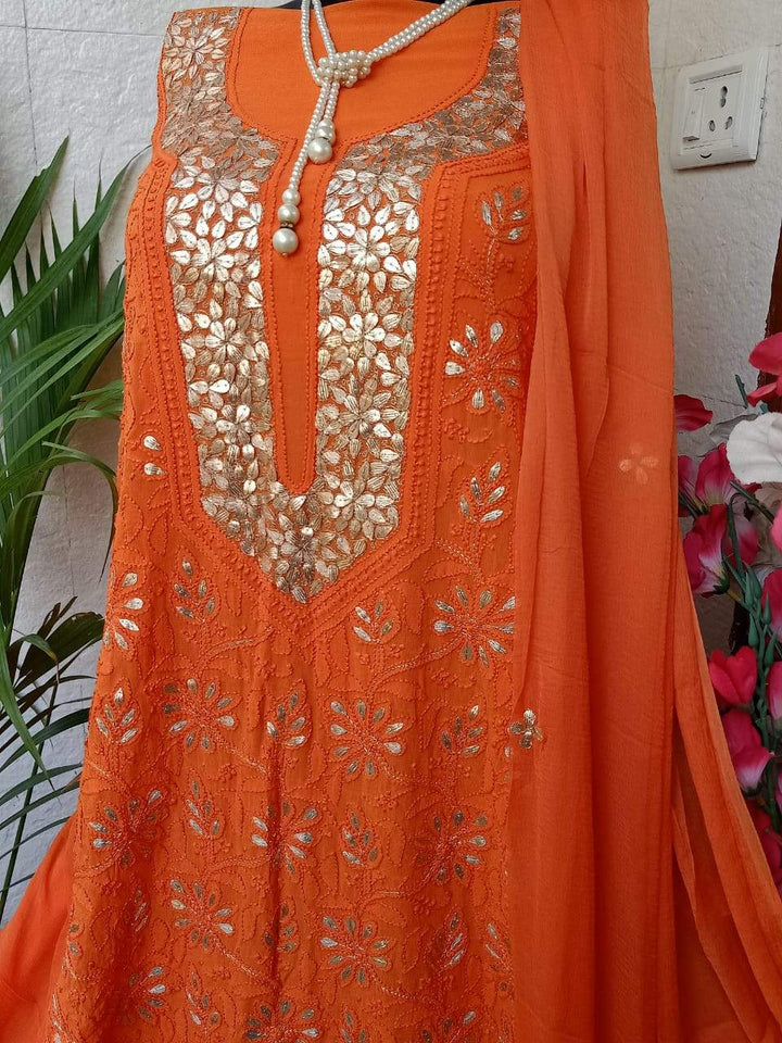 - "Sandhya" Sunset Orange Lucknowi Chikankari Gota Patti Salwar Suit Fabric