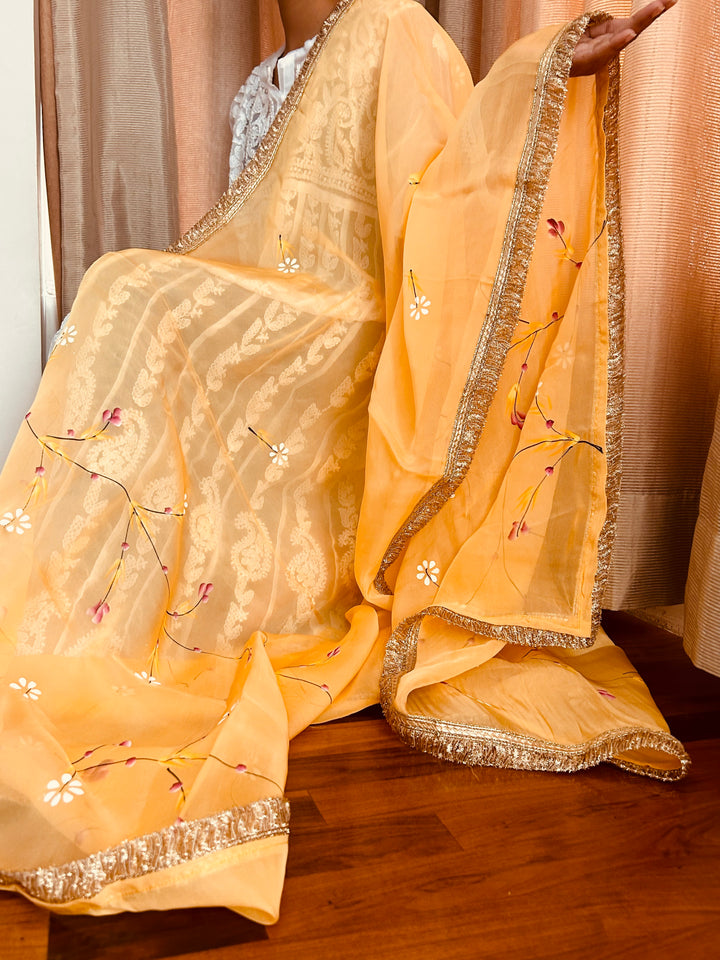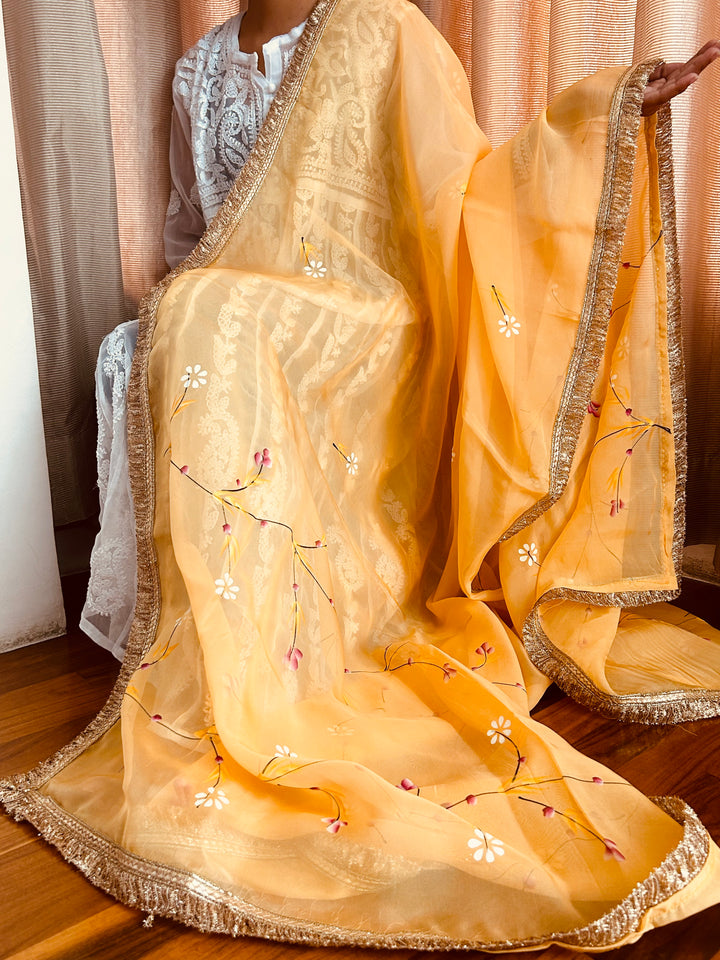 Grab Now,This hand painted Dupstairs.This Trendy Organza dupatta Comes With 2.5 Mtr length with hota border.This Organza Suit Set Is Perfect For Styling.