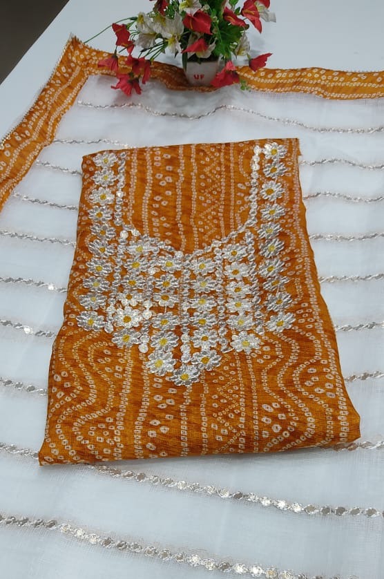 Karni- Orange Kota Doria Gota Embroidered Suit (unstitched)