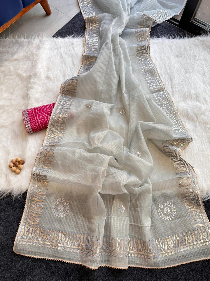 Chandrakanta- Silver Grey Kota Doria Gota Patti Saree 6.5 mtr