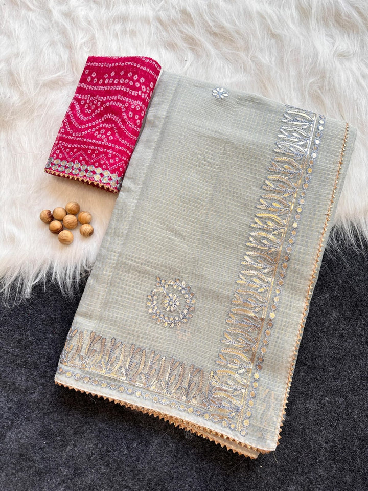 Chandrakanta- Silver Grey Kota Doria Gota Patti Saree Comes With Blouse. The Saree Comes With Designer Gota Patti Work On Border And Boota. Wear This Kota Doria Saree as Casual Meeting Saree Or Kitty Party Saree. Saree Length - 6.5 Mtr With Blouse.