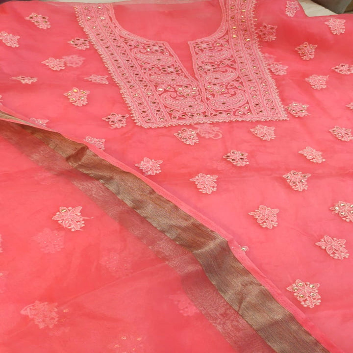 - Designer Peach Orange Organza Chikankari Salwar Kameez Set Unstitched