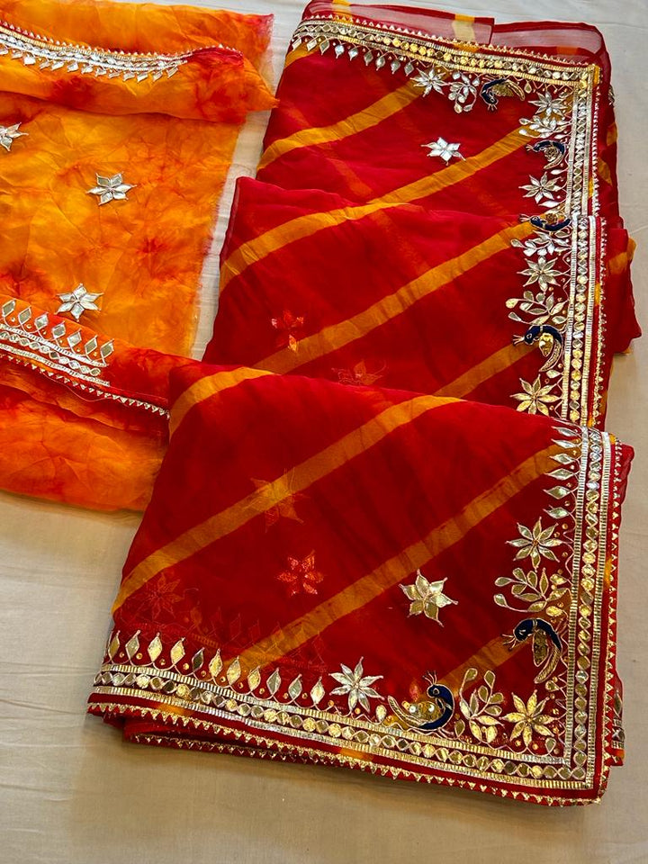 From The Land Of Rajasthan We Bring To You This Exquisite Hand Crafted Red Organza Gota Patti Work Saree. This Red Shade Gota Patti Saree With A Unique Gota Patti Work Make It A Must Have For Your Closet. Shop More Leheriya , Mothra And Bandhej Gota Patti Sarees At Jhakhas.Com.