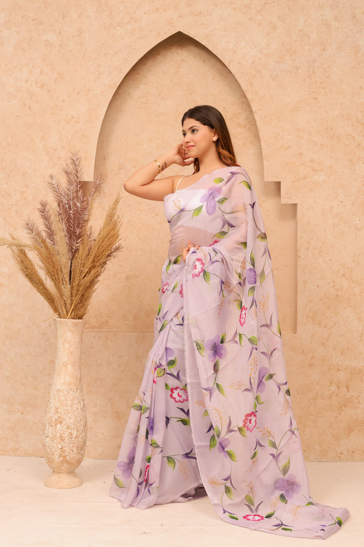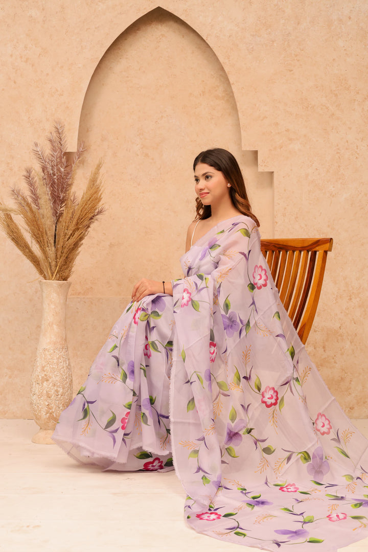 Parijat- Organza Hand Painted Saree In Lavender Colour