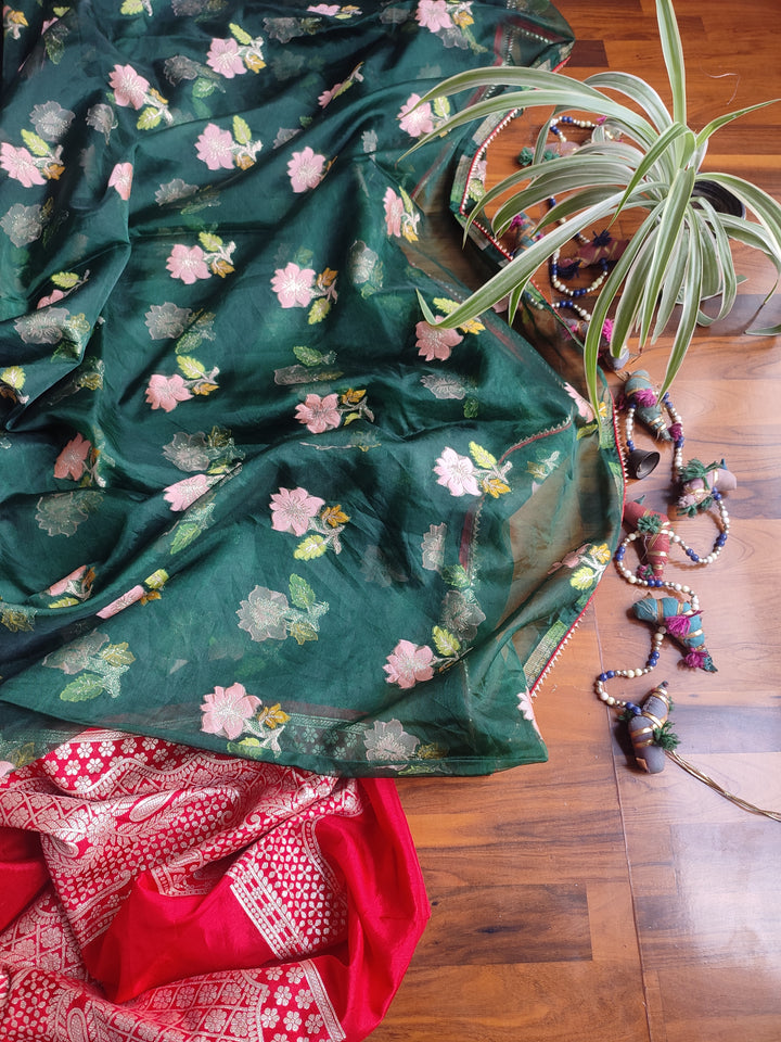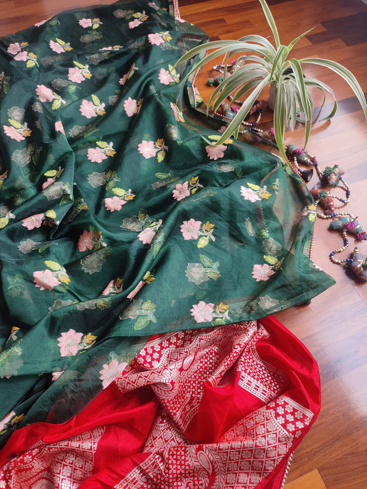 Organza Saree In Green Designer Saree With Zari Weaving, This Wine Saree Length Is 5.5 Meter Comes Wih Blouse Of 80 Cm As Shown In Picture,Free Shipping And Cod Available, Shipping Worldwide.