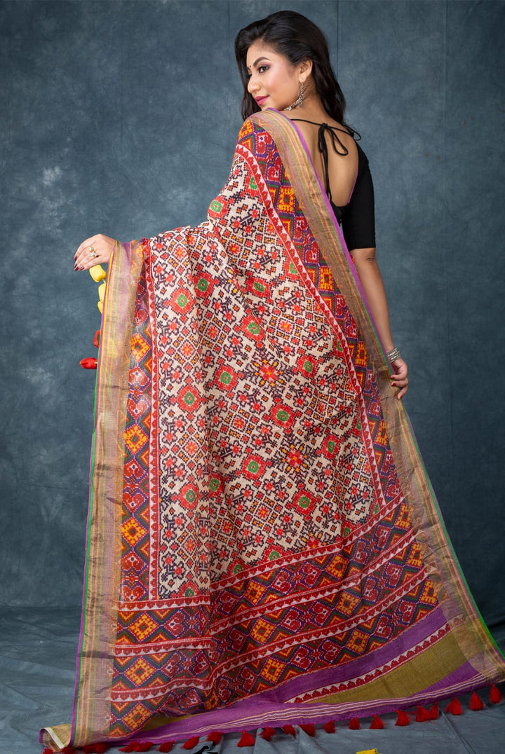 We Present. This Saree Features Beautiful Patola Prints All Over And Pallu It Is An Ultra-Lightweight, Skin-Friendly, And Comfortable Saree. It Comes With A Attached Blouse, Allowing You To Customize It In Your Own Style.
