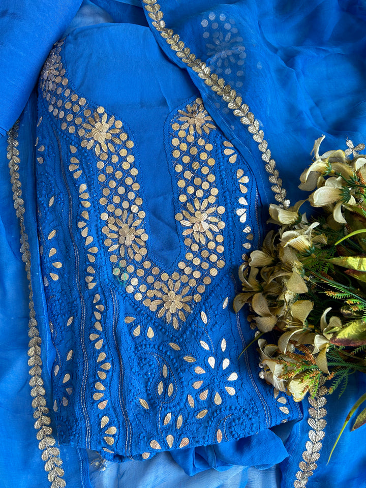 - “Neelam-e-Shahi” Cobalt Blue Lucknowi Chikankari Gota Patti Salwar Kameez Dress Material