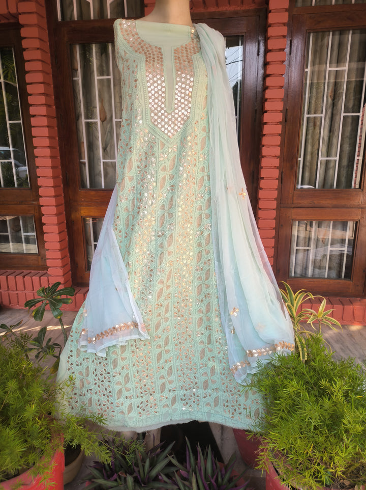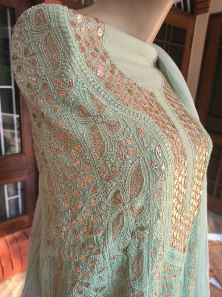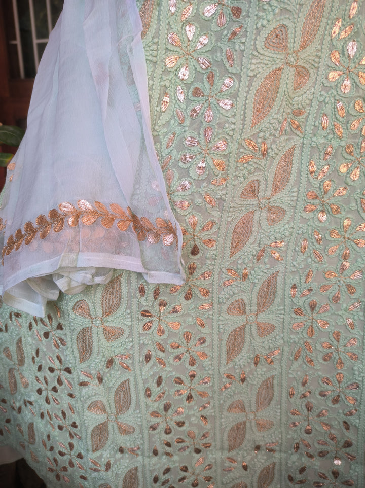 "Roohani” Sage Green Lucknowi Chikankari Gota Patti Salwar Suit(Dress Material)