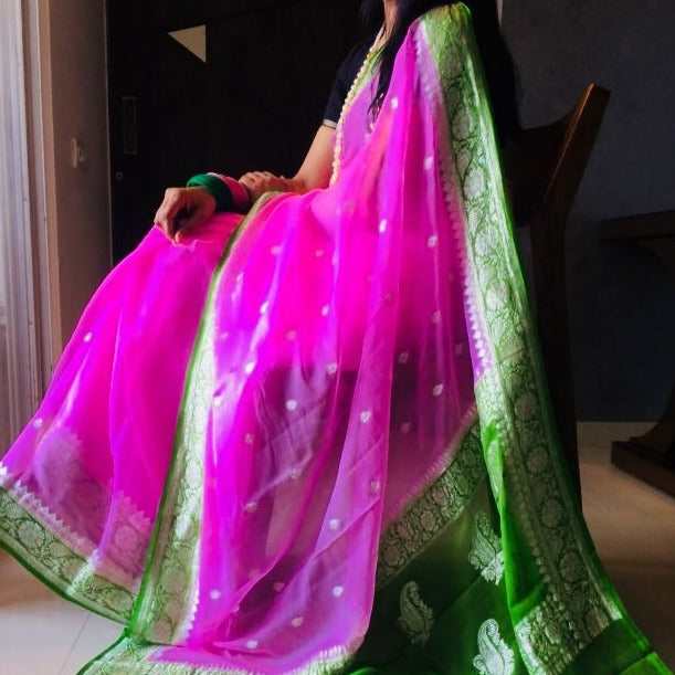 - Designer Royal Pink-Green Jaal Pure Banarasi Khaddi Georgette Saree