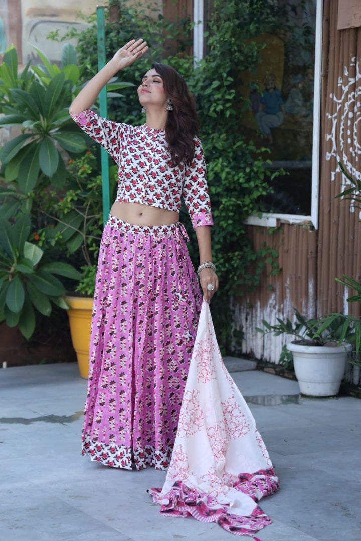 Pink & white Bagru Hand Block Printed Designer Top & Skirt With Mulmul Dupatta.