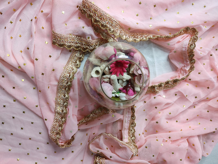 Pink Chiffon Dupatta2.5 Meter In Length Having Rose Gold Gota Border With Tiny Gota Motifs. This Blue Dupatta Is Perfect For Any Contrast Suit.This Blue Dupatta Is A Match For Teej , You Can Pair It With Any Lehenga Or Salwar Suit. This Chiffon Dupatta Is ,Free Shipping And Cod Available, Shipping Worldwide.