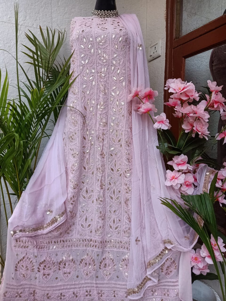 - “Gulabi Nazaara” Rose Pink Lucknowi Chikankari Gota Patti Salwar Kameez Dress Material