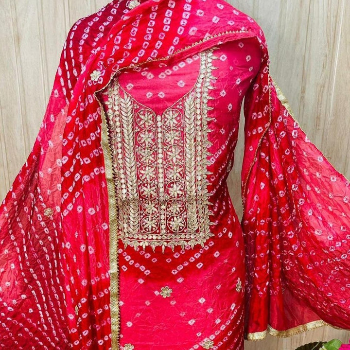 Bandhej Silk Gota Work Suit ,Silk Top With Gota Work And Silk Duptta With Gota Work And Plain Santoon Bottom, Shop Heavy Wedding Suits Online.Jaipuri Gota Patti Hand Work On Top(2.5mtr) With Designer BandhejDupatta (2.5 mtr) Which Comes With Border. The Dress Material Comes With Bottom (2.5 mt) Matching dupatta color.