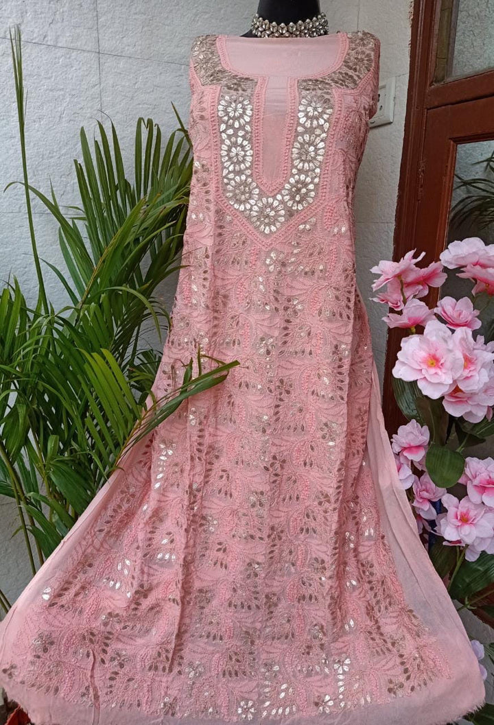 Sanobar –Pink colour Chikankari Gota Salwar Suit,This Chikankari Salwar Suit Comes With Pure Hand Karigari And Mukaish And Gota Patti Work As Shown In The Picture.Georgette Chikankari Top With Chikankari Gota/Mukaish Work And Chiffon Duptta With Gota Work And Matching Plain Santoon Bottom.It comes with 3mtr top, 2.5 mtr bottom, 2.5 dupatta