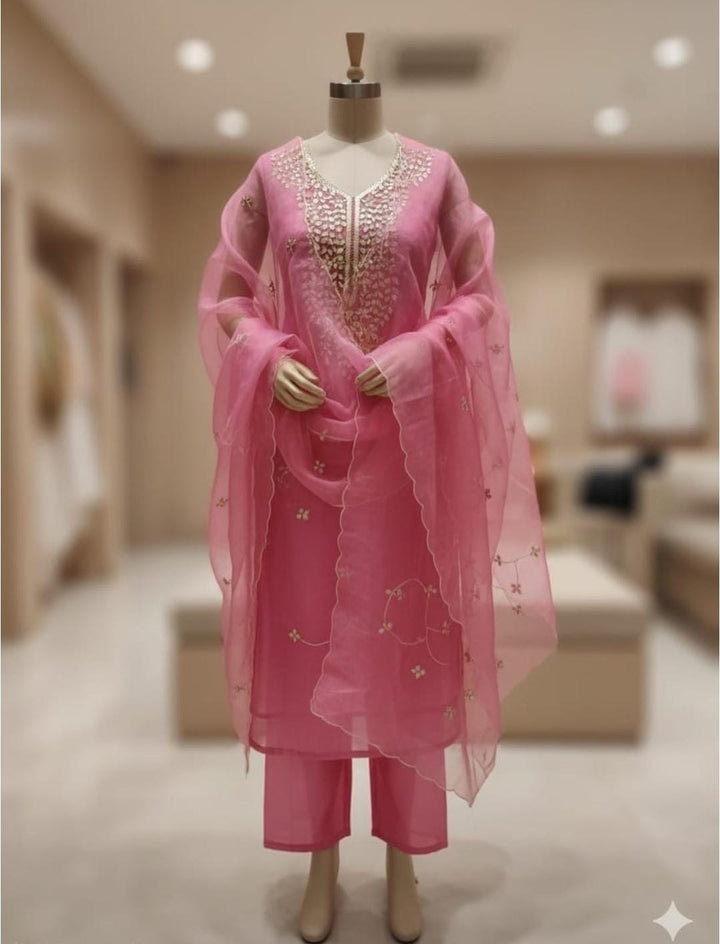 Pink Color Organza heavy gota patti neck hand Work Suit With Designer Dupatta,This Three Piece Salwar Suit Comes With Matching Bottom Of Dupatta Color, Each Fabric Is 2.5 Mtr Long.