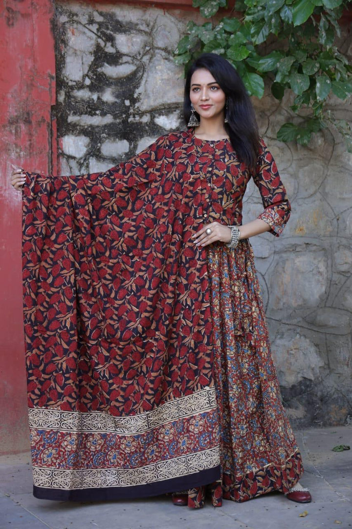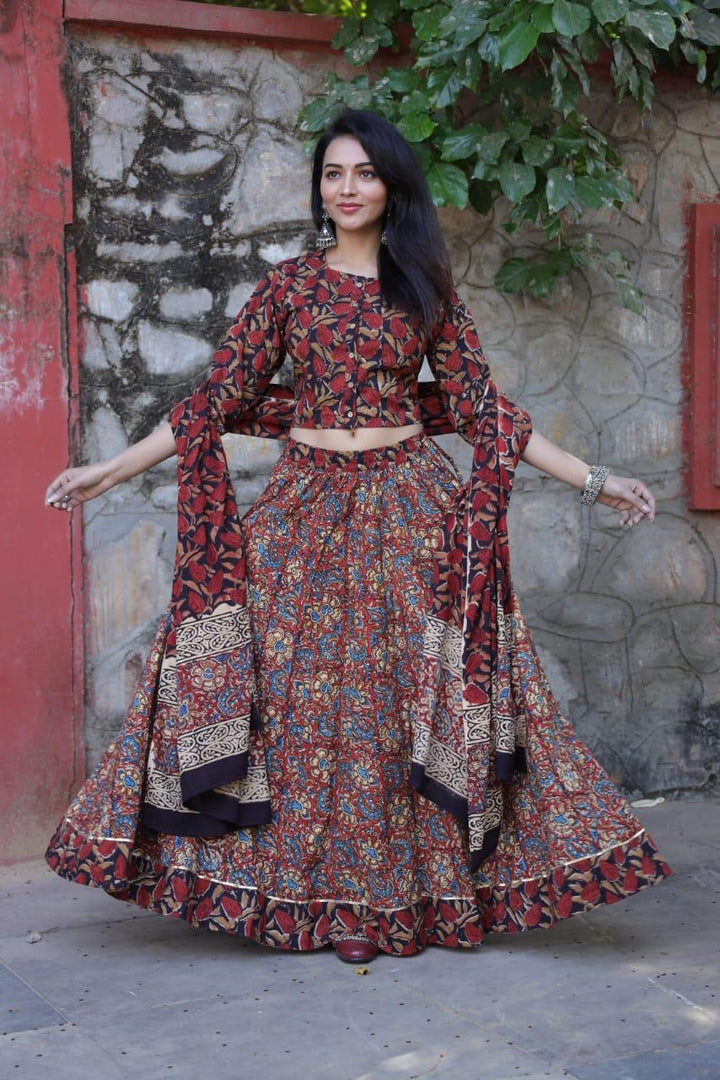 Maroon Bagru Hand Block Printed Designer Top & Skirt With Mulmul Dupatta.