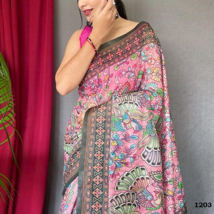 Pink Cotton Kalamkari Digital Print Saree