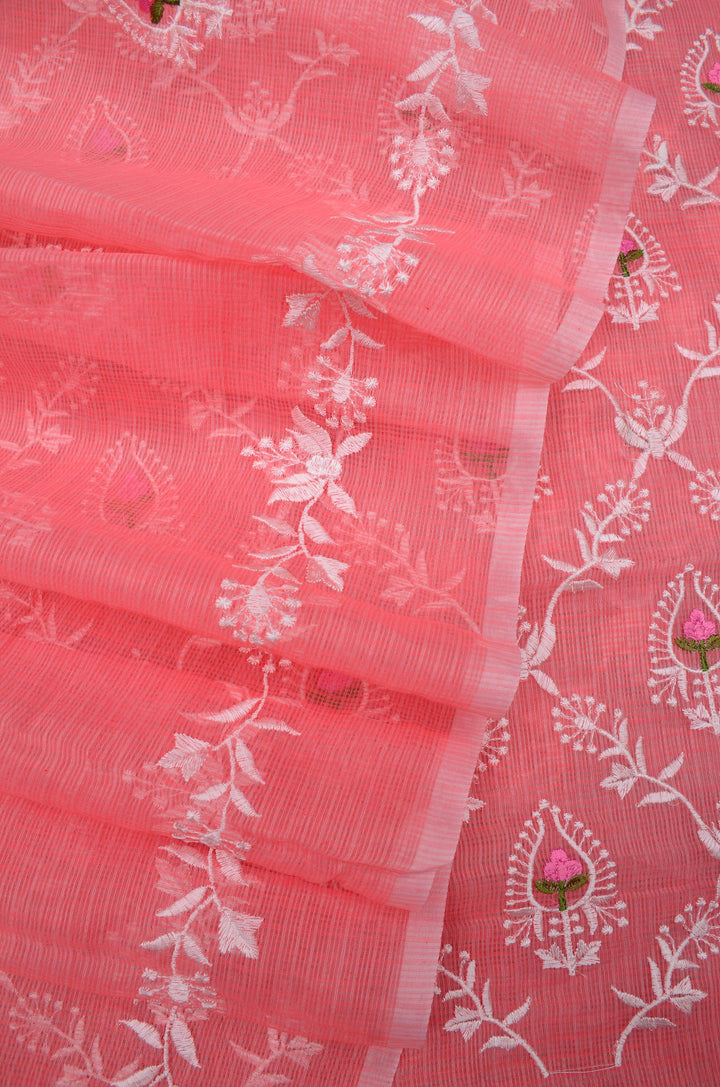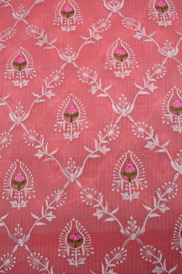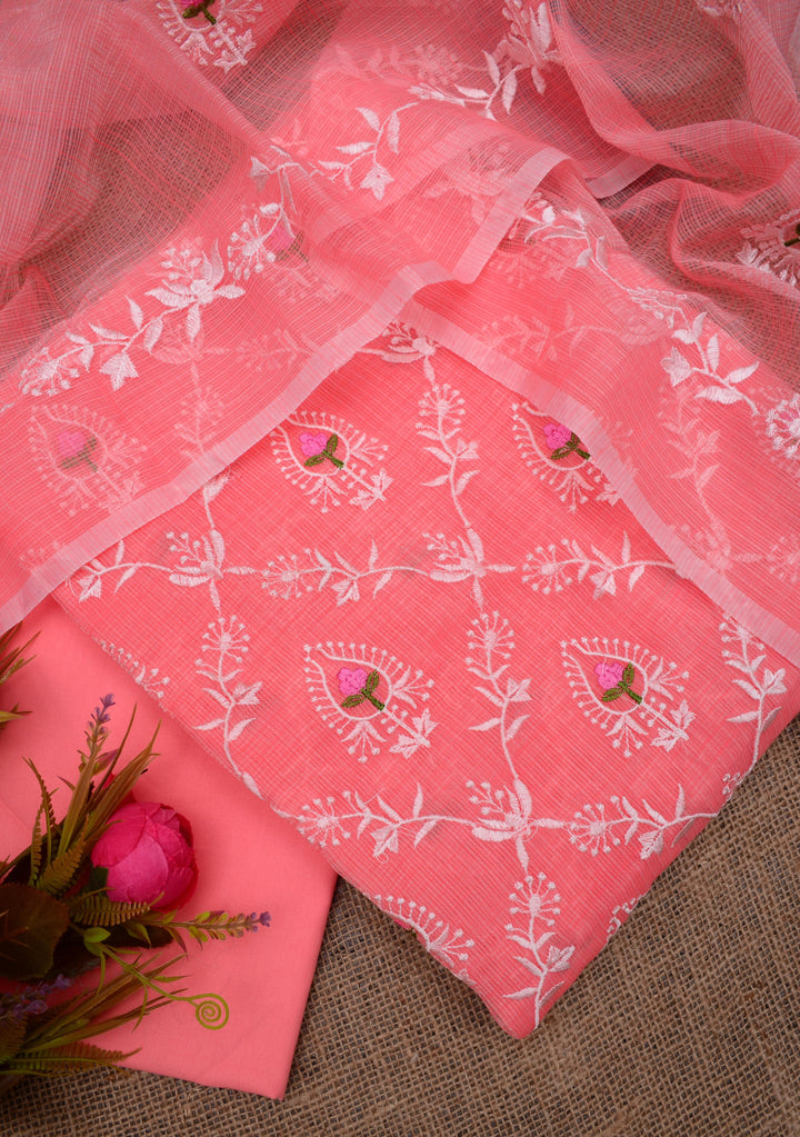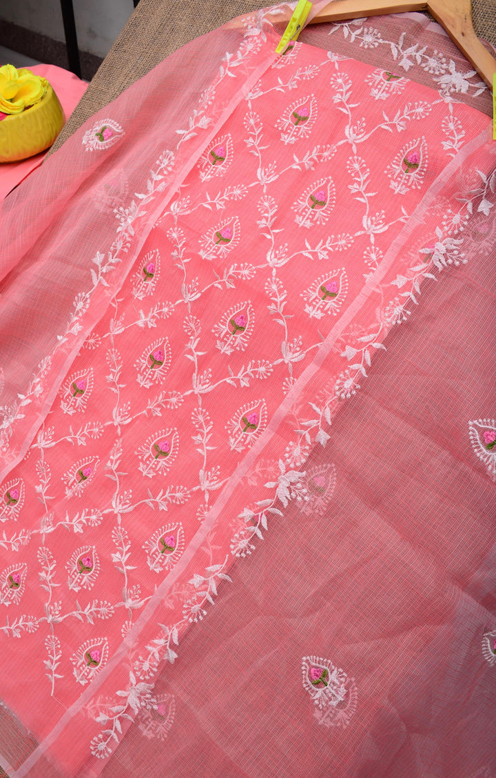 Shefali- Pink Embroided Kota Doria Suit Fabric With Dupatta (unstitched)