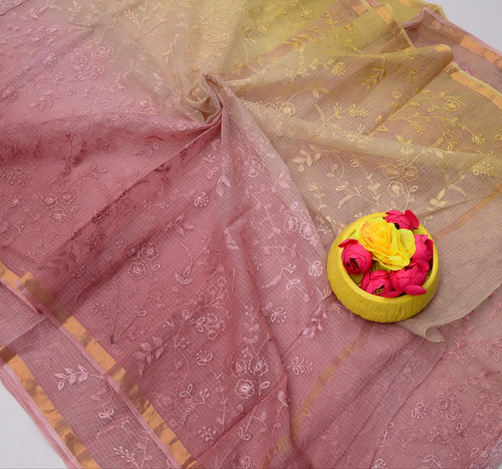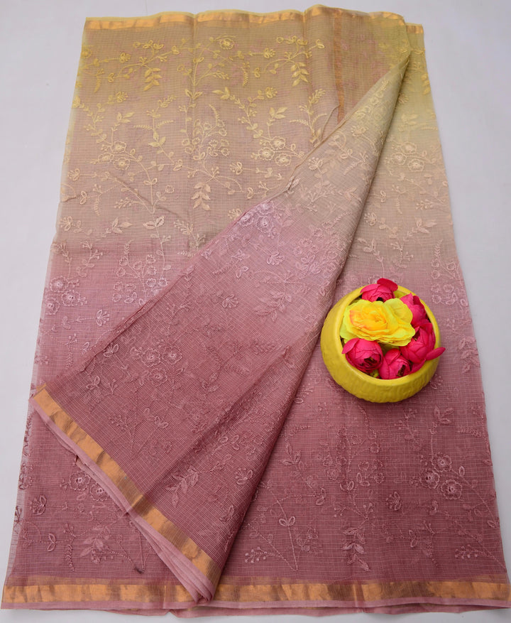 Roopdevi- Mauve Pink and olive green Kota Doria Embroidery Work Saree, This Kota Doria Saree In Cotton Comes With Blouse.Wear This Kota Doria Saree as Office Wear Saree, Daily Wear Saree Or Kitty Party Saree. Saree Length - 6.5 Mtr With Blouse.