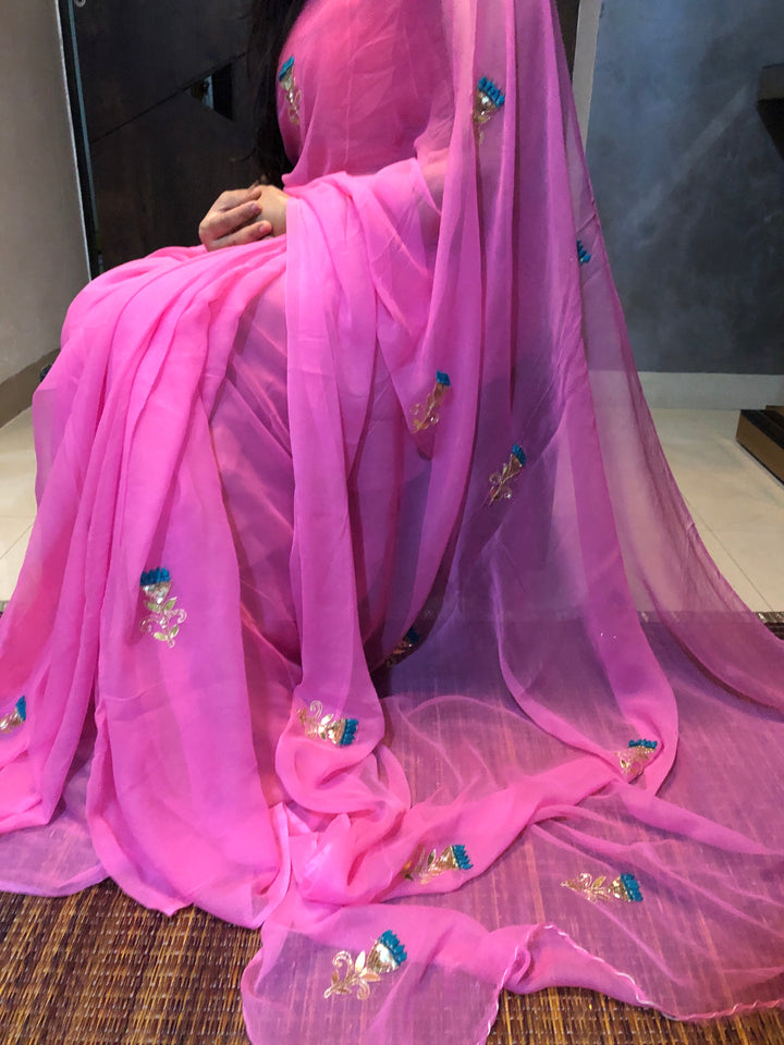 Pink Chiffon Gota-Patti Saree For Perfect Look On Your Evening. This Delicate Chiffon Saree Has Beautiful Gotapatti Flowers Embriodery On Whole Saree.