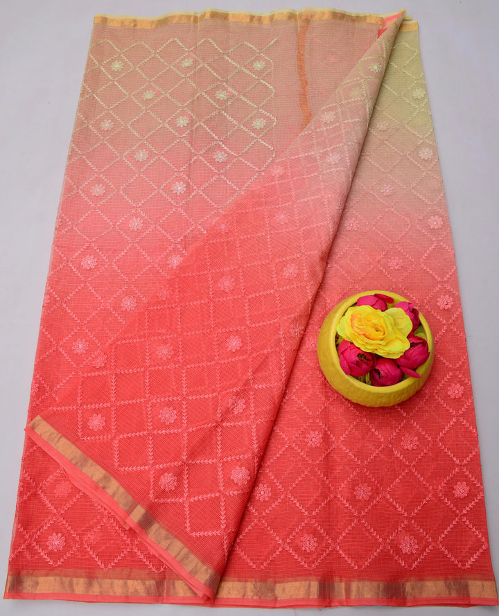 Kunwari- Red & Beige Kota Doria All Over Embroidery Work Saree, This Kota Doria Saree In Cotton Comes With Blouse.Wear This Kota Doria Saree as Office Wear Saree, Daily Wear Saree Or Kitty Party Saree. Saree Length - 6.5 Mtr With Blouse.