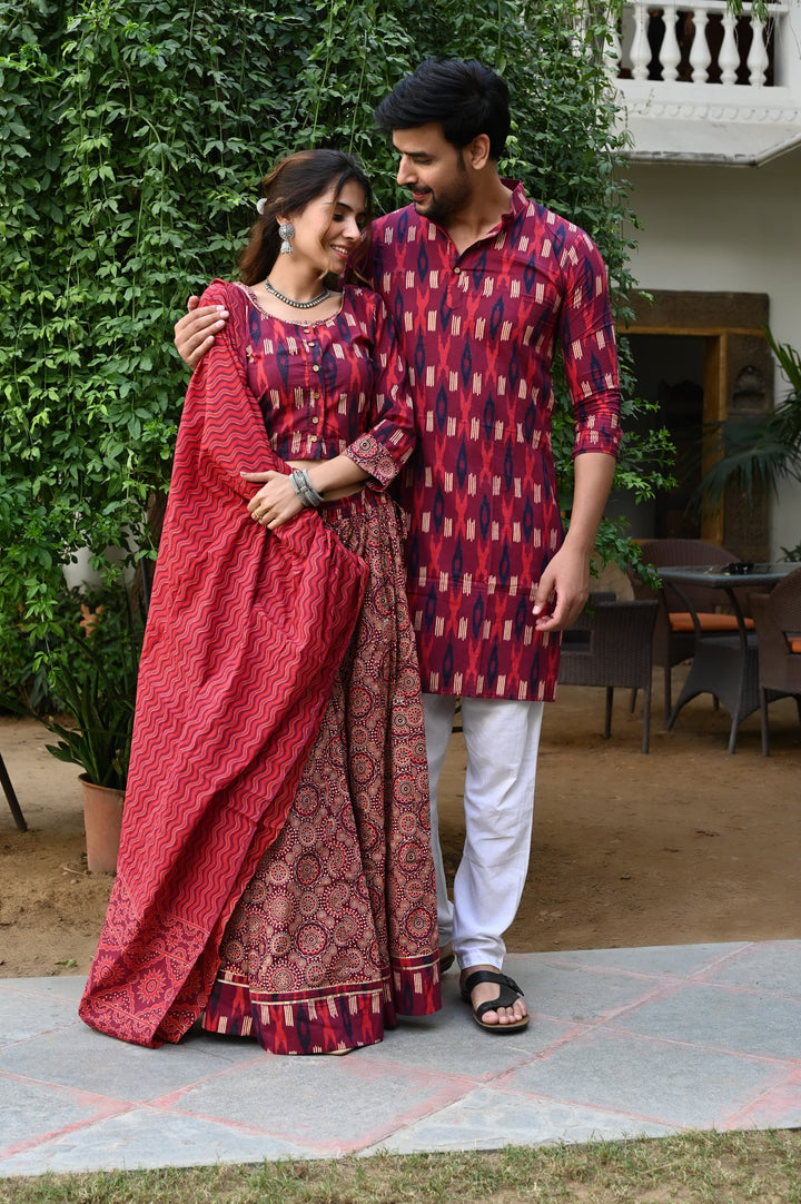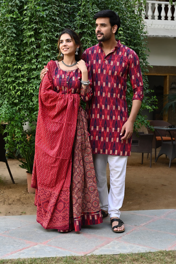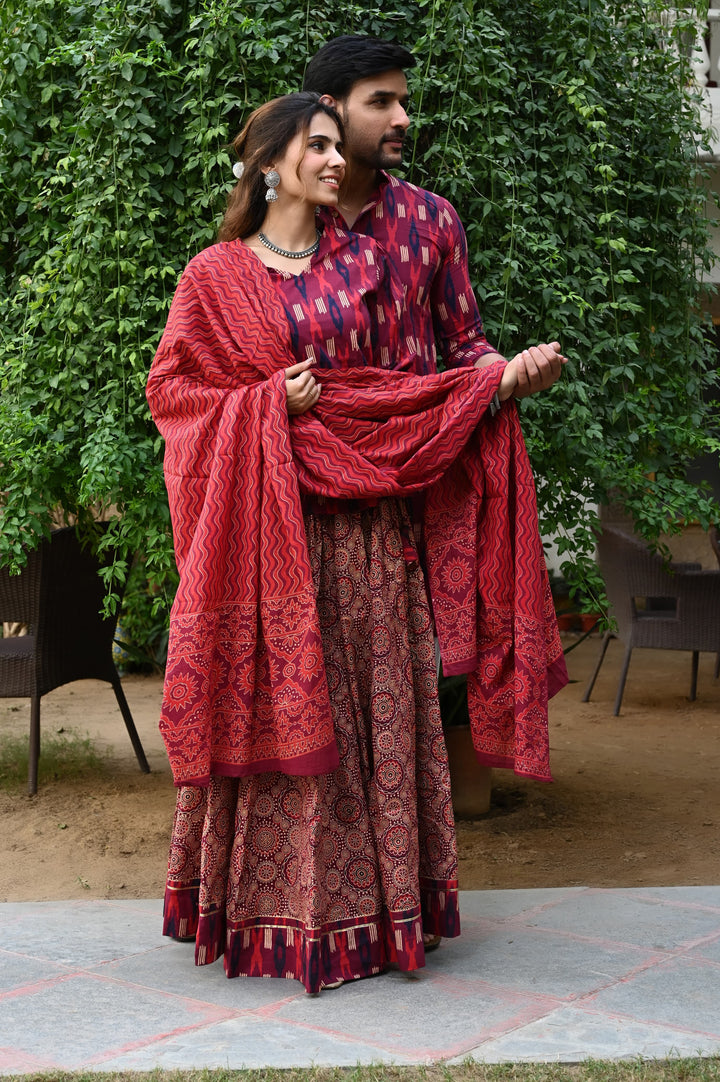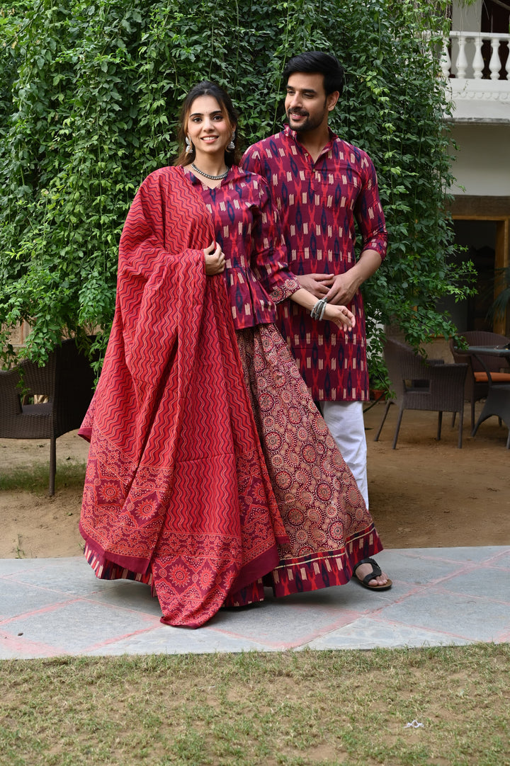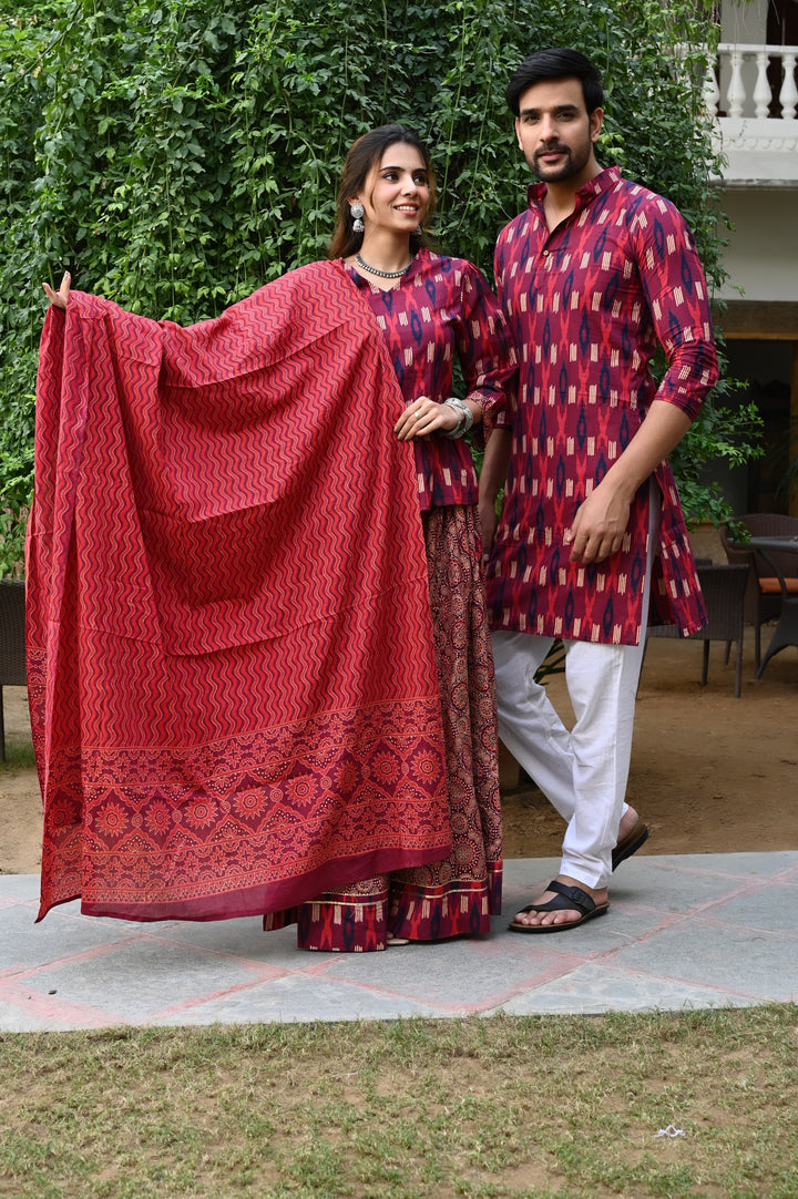 Red Pure Cotton Twinning Couple Set In Block Print