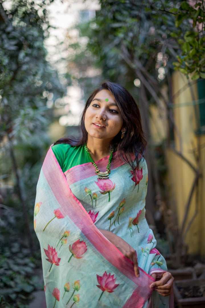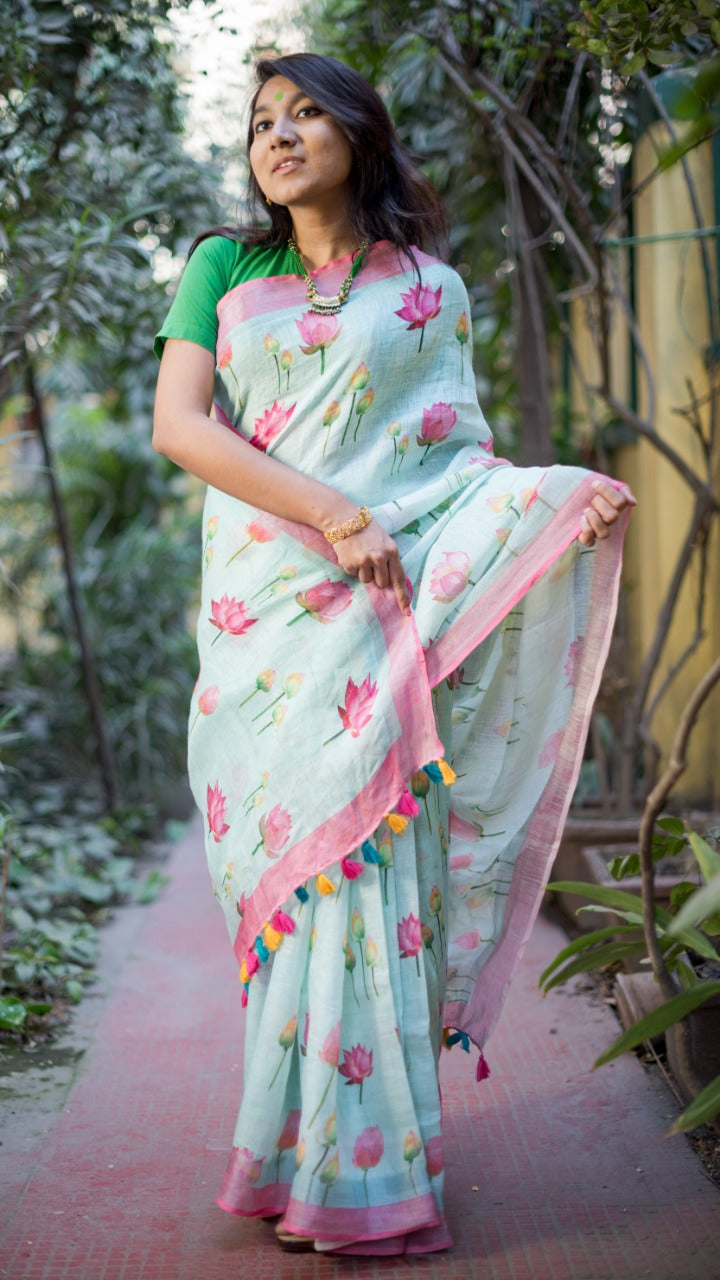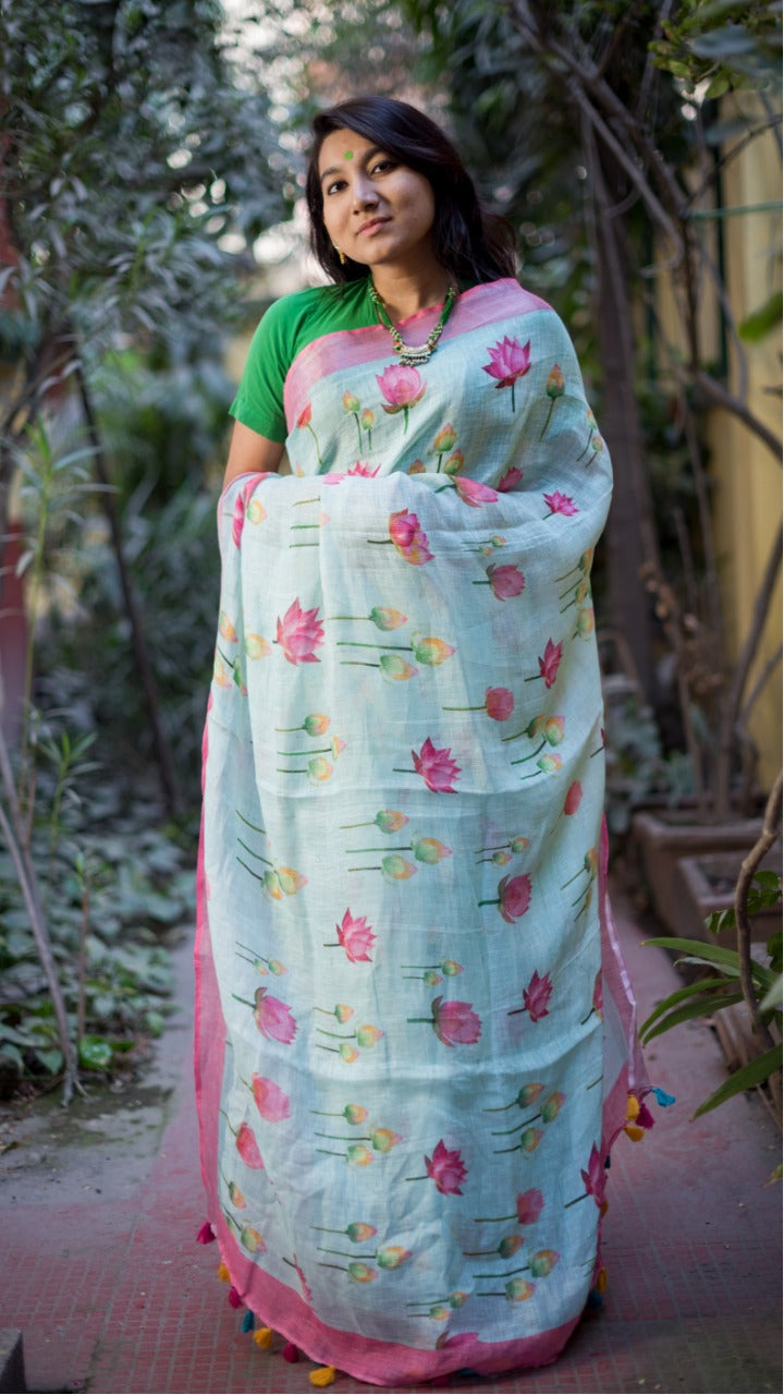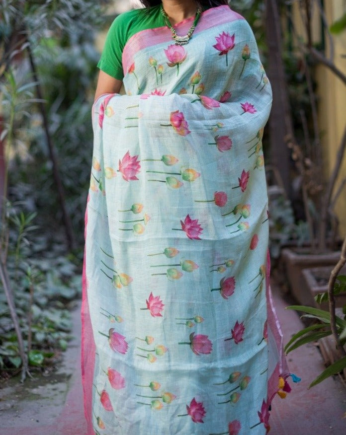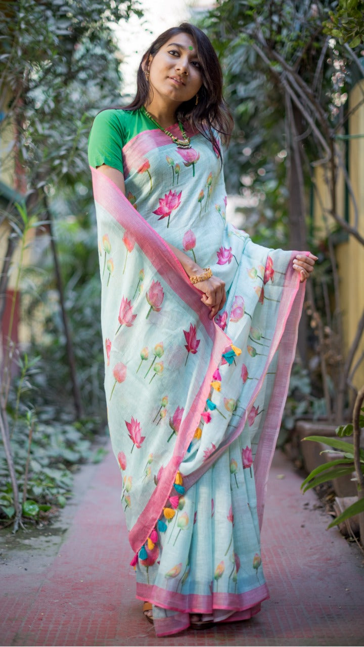Sky Blue Printed Pure Linen