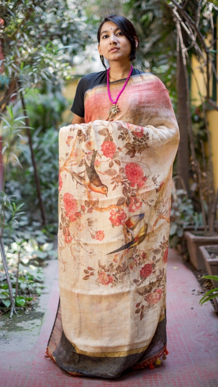 Ready To Drape This Beauty? We Present To Our Classic And Most Love Cream Pure Linen Saree Linen Saree. A Must Have In Your Ethnic Wardrobe As It is An All Season And Occasion Wear Saree. This Saree Features Beautiful Prints All Over And Pallu It Is An Ultra-Lightweight, Skin-Friendly, And Comfortable Saree. It Comes With A Attached Blouse, Allowing You To Customize It In Your Own Style.