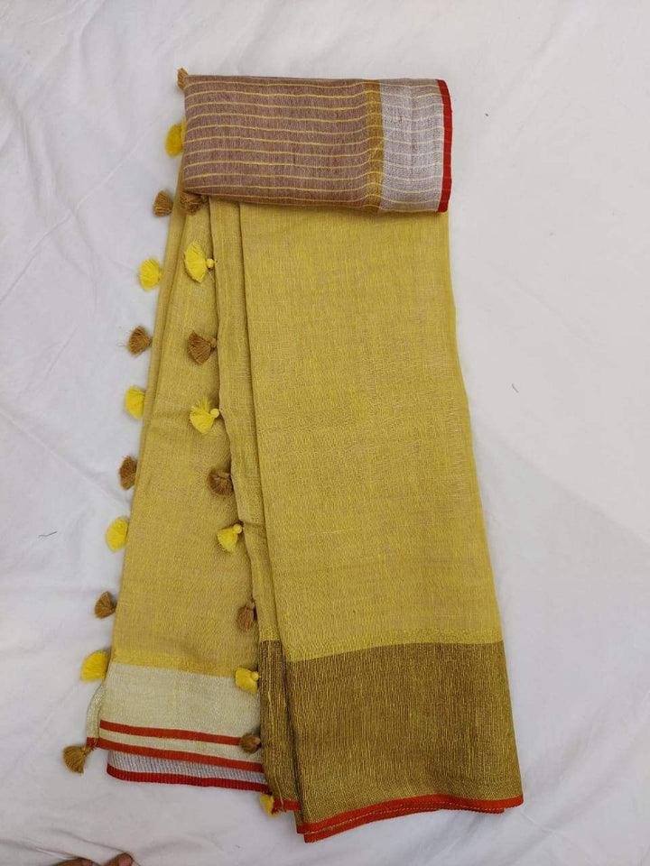 Steal The Show With Our Yellow Pure Linen Saree Made Out Of Chosen Threads This Saree Is A Must-Have In Your Traditional Wardrobe. This Beautiful Saree Features Beautiful Zari Weaves Which Makes Them Perfect For Any Of Occasion. This Linen Saree Comes With A Contrast Blouse Which Can Be Styled According To Your Design. Tassels On Pallu Adds To its Beauty