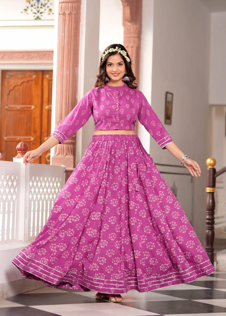 Purple Bagru Hand Block Printed Designer Top & Skirt With Mulmul Dupatta.