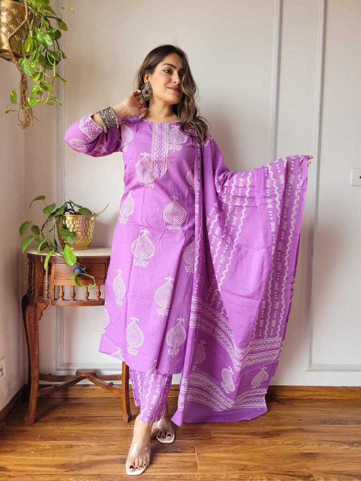 Make some space in your casual wardrobe for this cotton Purple colored kurti pant set with a dupatta. Comes with a Cotton bottom and a Cotton dupatta with tassels. Women can buy this set to wear for their casual wear, office wear, and weekend get-together. This Beautiful set will surely fetch you compliments for your rich sense of style.