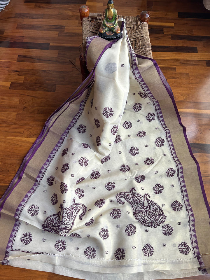 Rajasree- Purple Cream Color Kota Doria Chikankari Work Saree